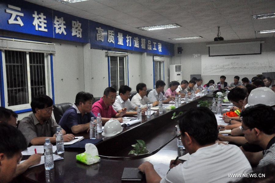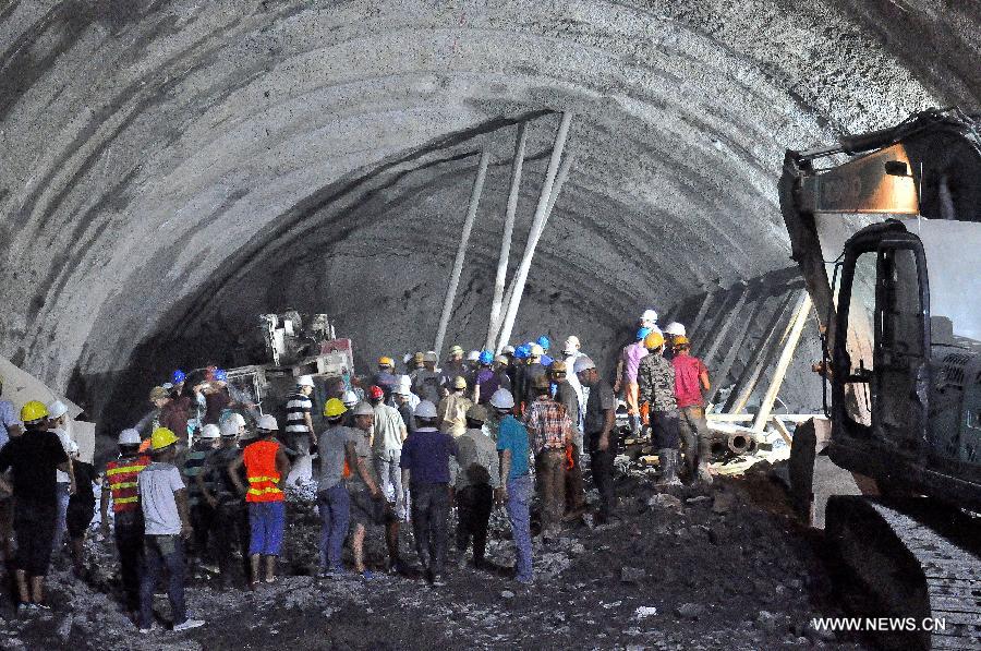 Rescuers work in a collapsed railway tunnel in Funing, southwest China's Yunnan Province, July 15, 2014. Rescuers were working all out Monday night hoping to reach the 15 workers who had been trapped in the debris of the collapsed railway tunnel in Funing County. The tunnel, known as Funing No. 1 tunnel, was on a 710-km railway linking Kunming with Nanning, capital of the neighboring Guangxi Zhuang Autonomous Region. Part of the tunnel, which was still under construction, collapsed at 4 p.m. on Monday.(Xinhua/Yang Wenbin)