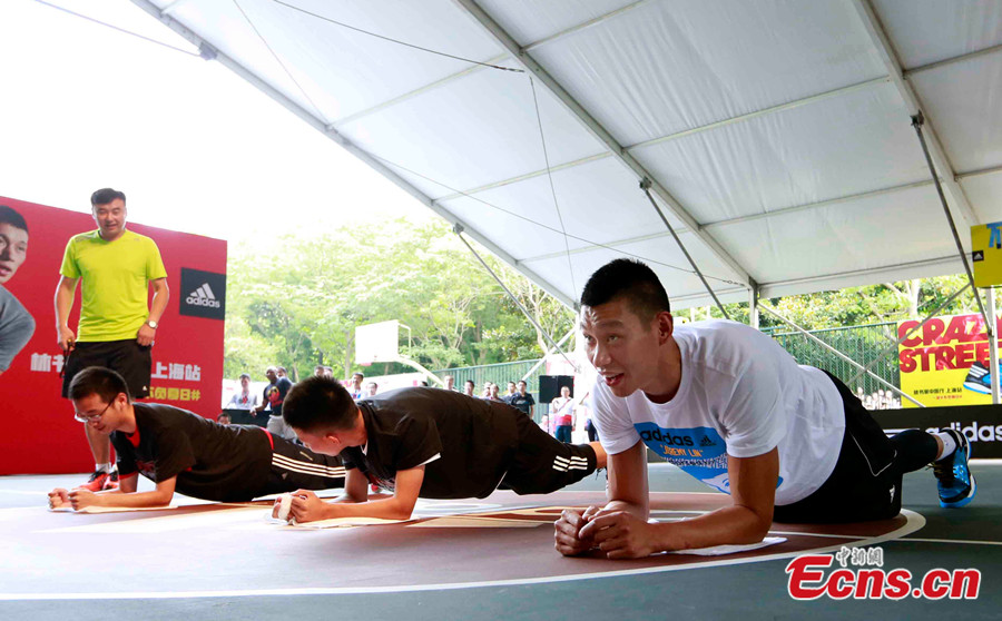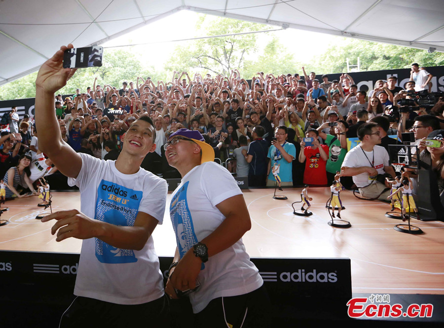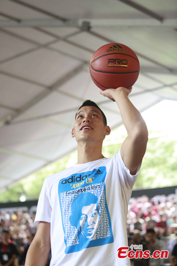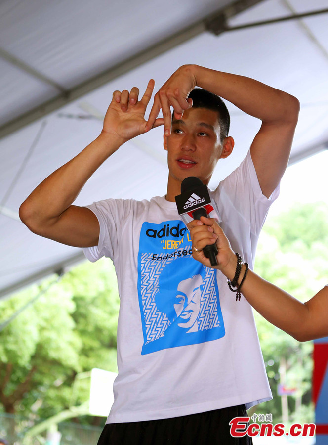 Jeremy Lin shows basketball skills at a fan meeting in Shanghai’s Xujiahui Park on July 14, 2014. The basketball star also shared his delight of signing with the Los Angeles Lakers with fans during the activity. [Photo: China News Service/ Shen Hai]