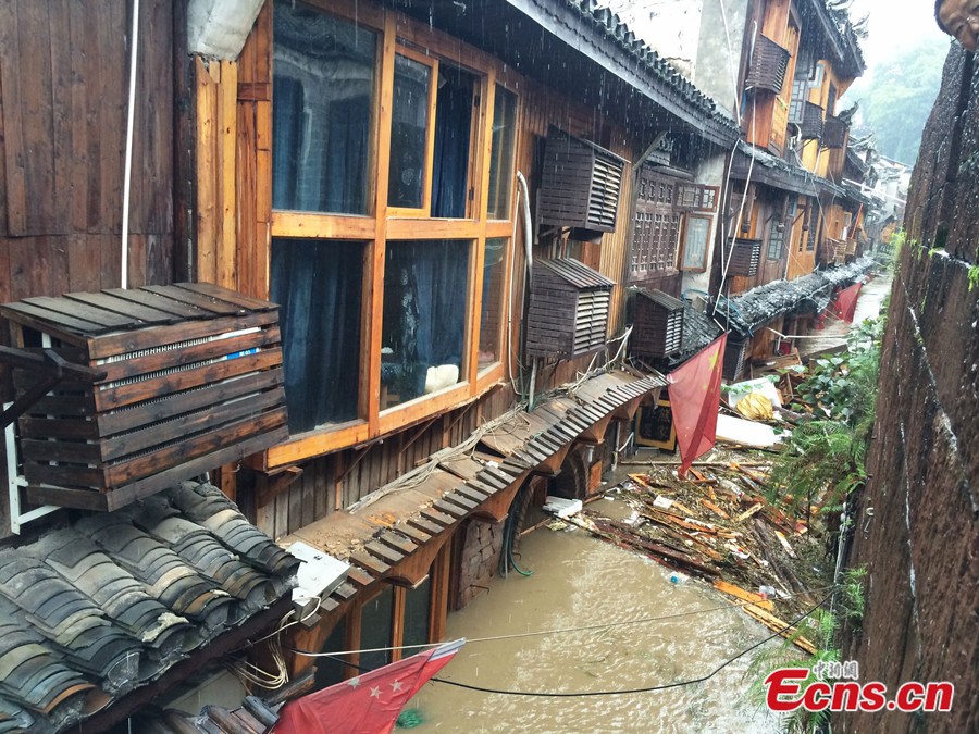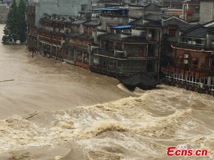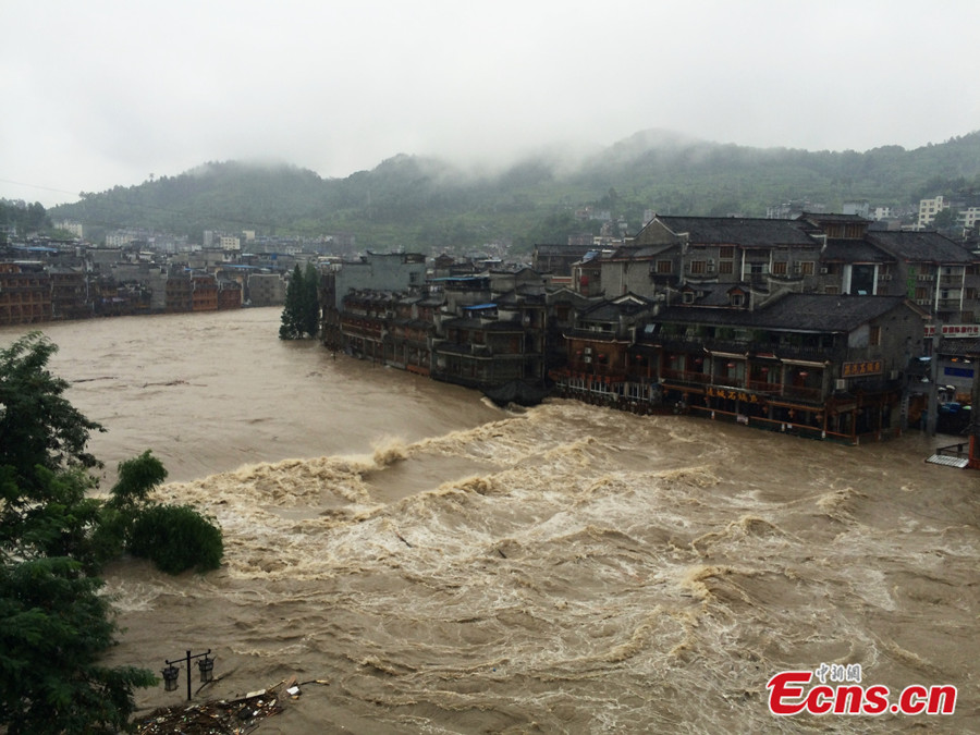 Continuous rainstorms raise the water level of the Tuojiang River in Central China’s Hunan province on July 15, 2014, flooding the popular tourist site of Fenghuang Ancient Town along the river. Torrential downpours have inundated streets, caused blackouts and traffic jams in the town. [Photo: China News Service/ Zhong Xin]