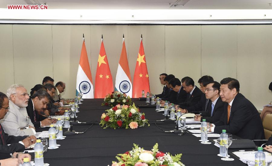 Chinese President Xi Jinping(R) meets with Indian Prime Minister Narendra Modi in Fortaleza, Brazil, July 14, 2014. (Xinhua/Li Xueren)