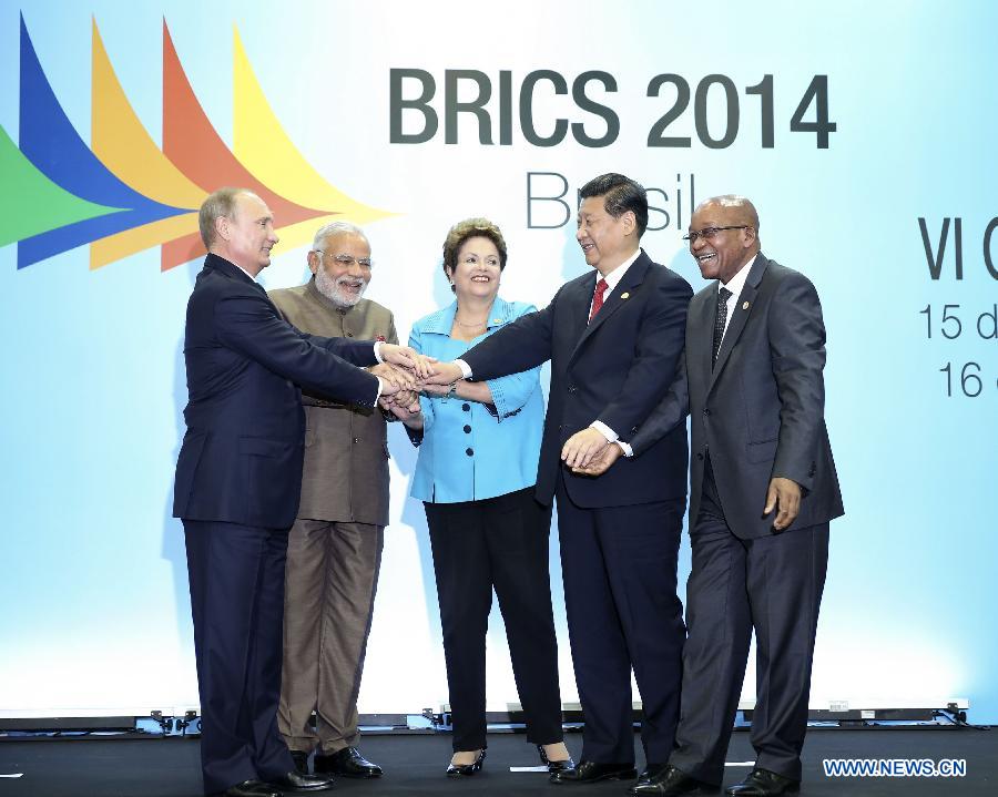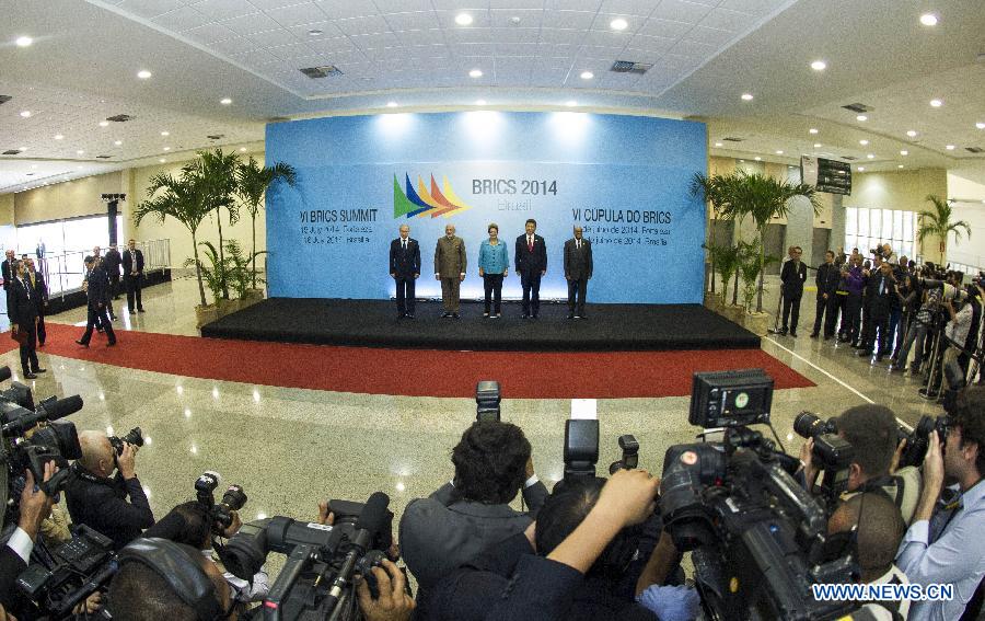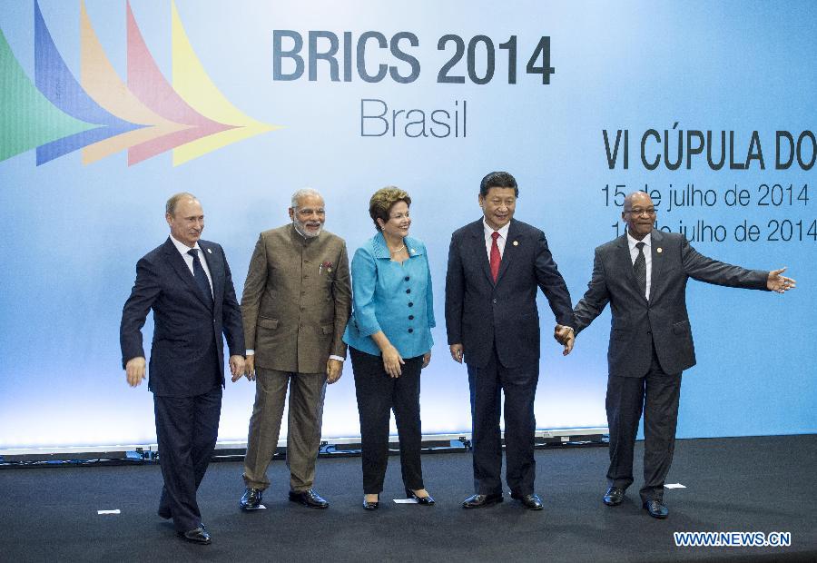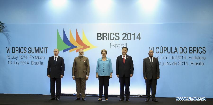 Chinese President Xi Jinping (2nd R) poses for a group photo with Russian President Vladimir Putin (1st L), Indian Prime Minister Narendra Modi (2nd L), Brazilian President Dilma Rousseff (C), and South African President Jacob Zuma during the sixth BRICS summit in Fortaleza, Brazil, July 15, 2014. (Xinhua/Lan Hongguang)