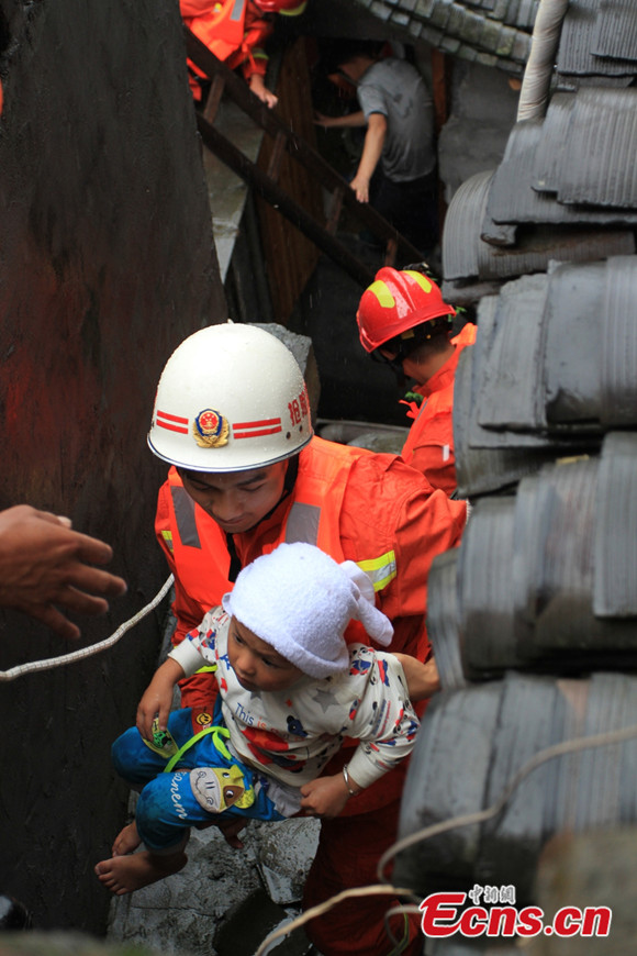 Heavy rainfall has triggered floods, hitting the famous Fenghuang ancient town in Fenghuang county of central China's Hunan province on July 15, 2014. Waters in the nearby Tuojiang River rose above warning level, causing severe flooding and power outages. More than 120,000 locals and tourists have been evacuated since Monday night as record downpours hit the county and several scenic spots were closed. [Photo: China News Service / Tian Rujun]