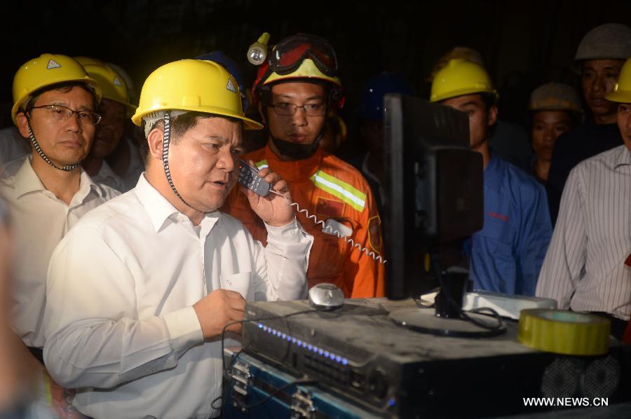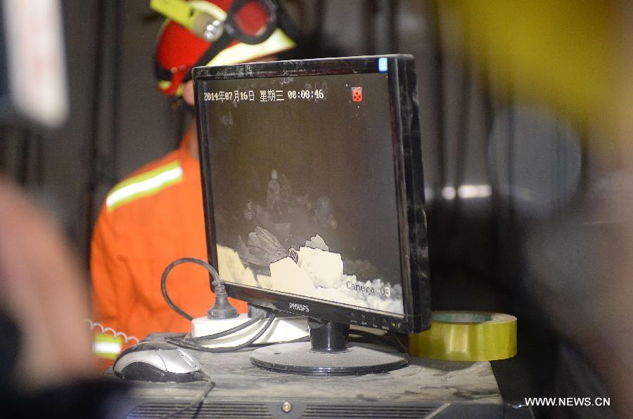 Rescuers work at the site of railway tunnel collapse in Funing County of Zhuang and Miao Autonomous Prefecture of Wenshan, southwest China's Yunnan province, July 16, 2014. Fourteen workers are confirmed to be alive but another one remains out of contact so far after part of a railway tunnel collapsed. The tunnel collapsed at around 4 pm on July 14, trapping 15 workers. (Xinhua/Hu Chao)