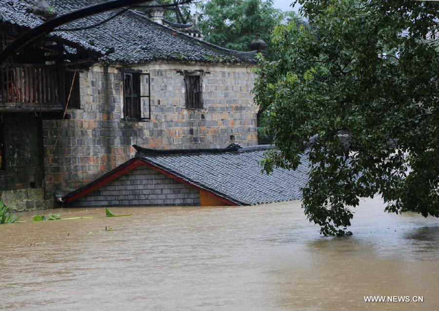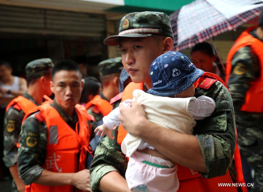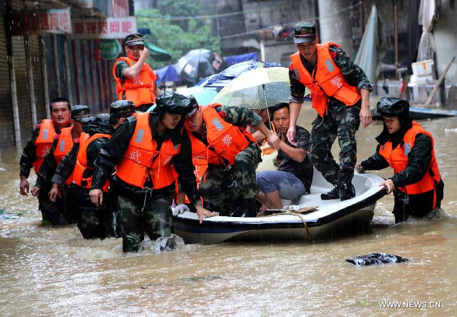 Rescuers evacuate people trapped in flood water in Jishou, central China's Hunan Province, July 16, 2014. Downpours hit Jishou since July 15. The Hunan Provincial Meteorological Station issued a red alert for rain on Wednesday. (Xinhua/Peng Biao)