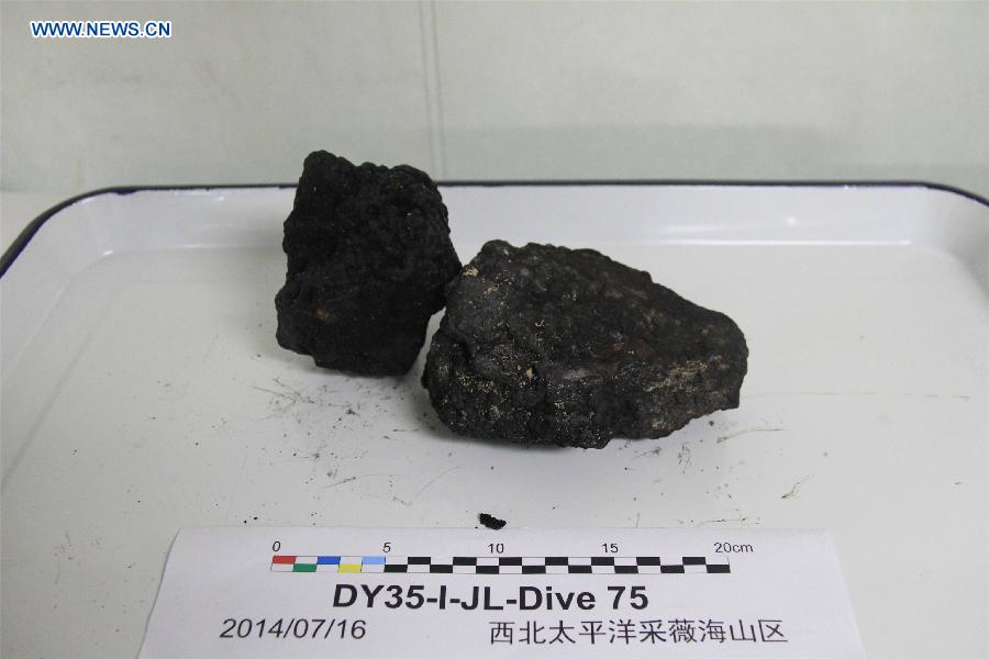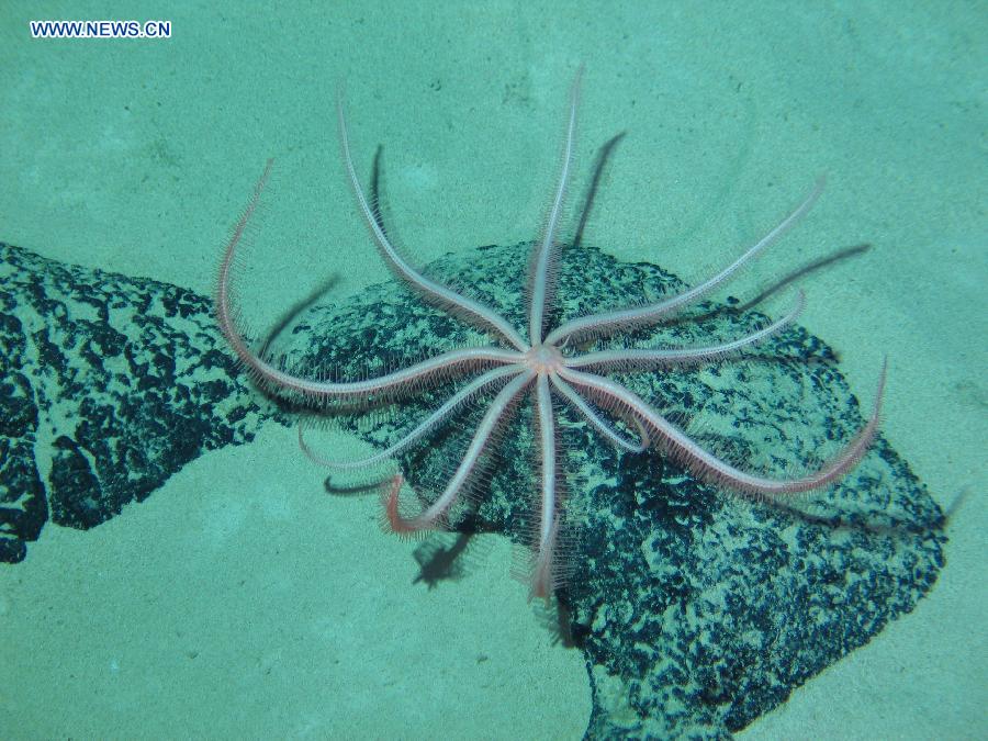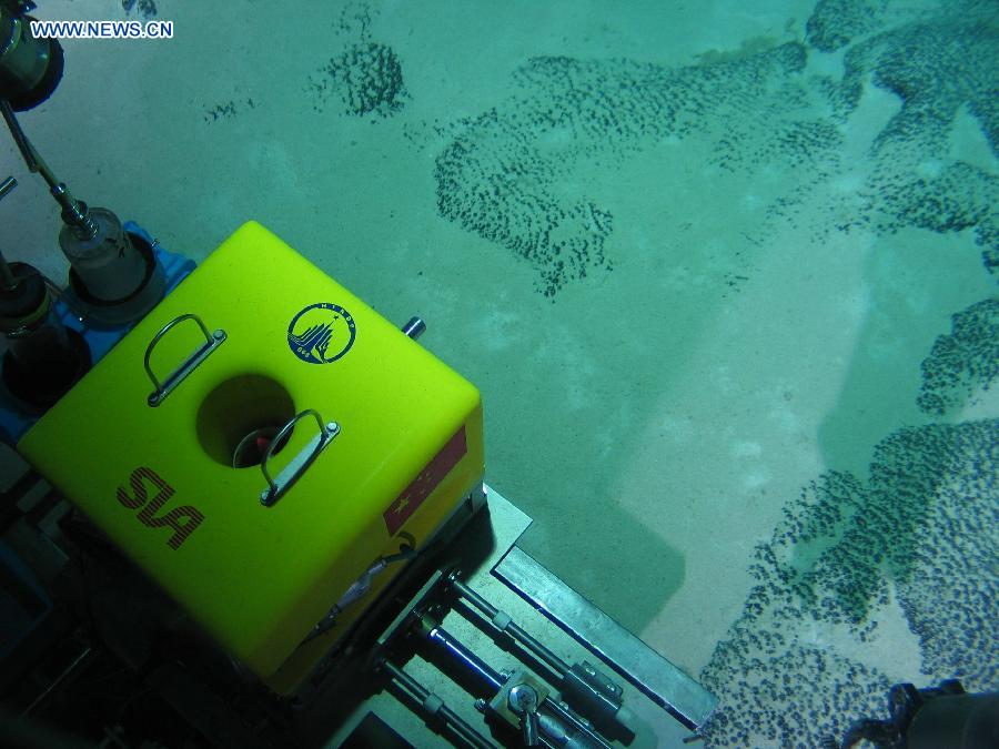 Jiaolong, China's first manned deep-sea submersible, is lifted out of sea water after a dive in the northwest Pacific Ocean, July 16, 2014. The submersible has launched a voyage in the northwest Pacific Ocean, during which it will research cobalt-rich crusts and life forms inhabiting the bottom of the sea. (Xinhua/Luo Sha)