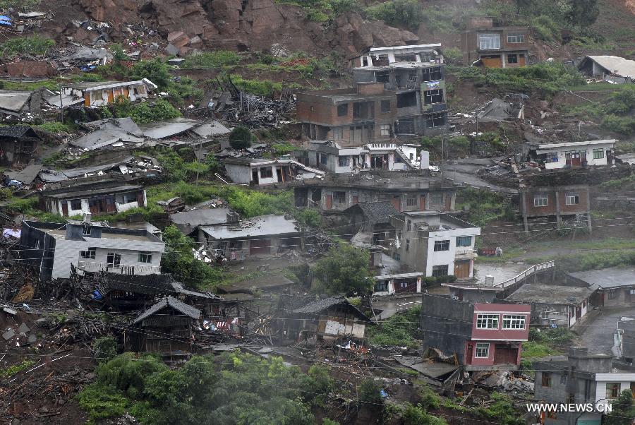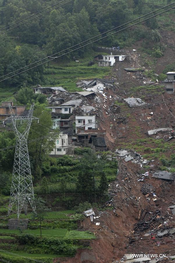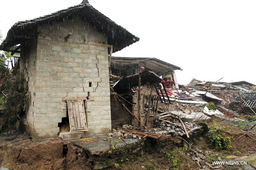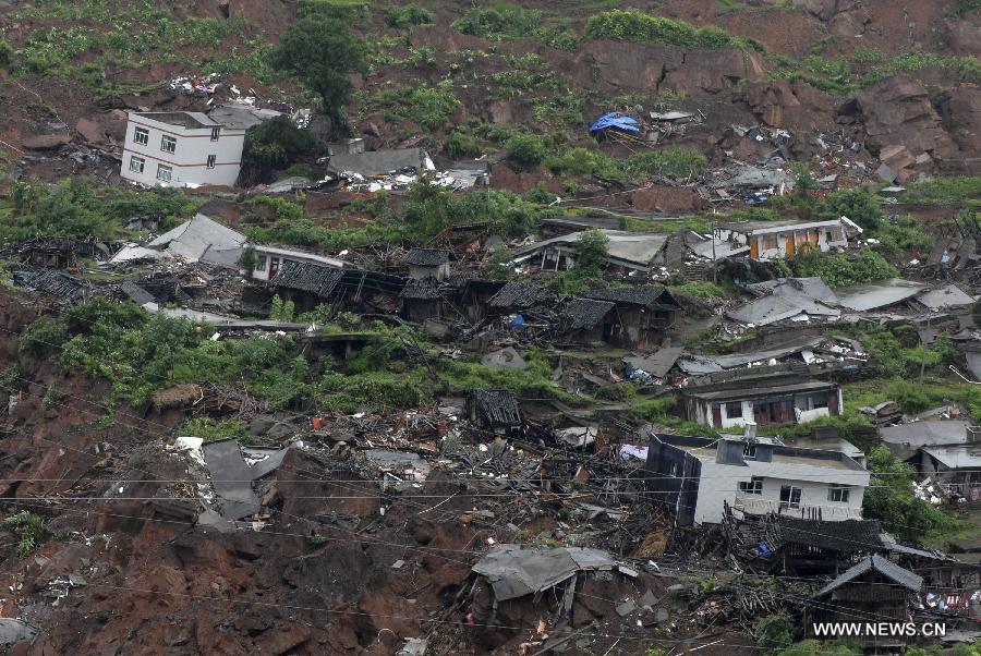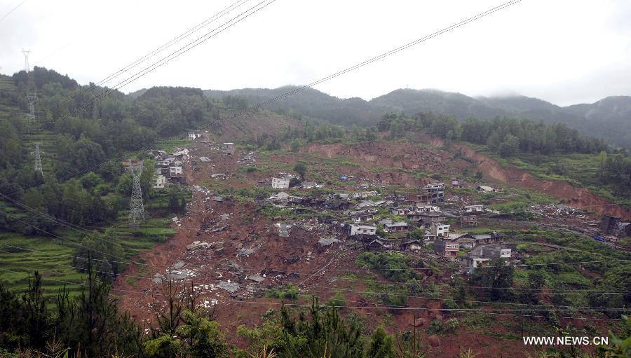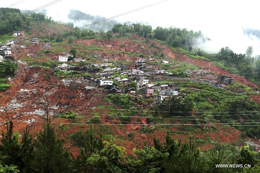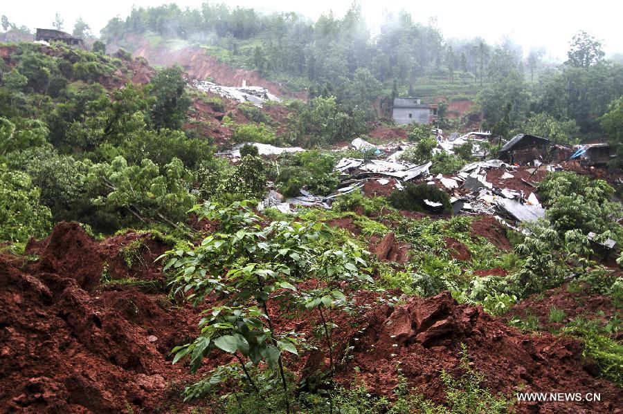 Photo taken on July 17, 2014 shows the site of landslide in Gedi Village of Muhuang Township in Yinjiang Tu and Miao Autonomous County, southwest China's Guizhou Province. The landslide here, which occurred at 3 a.m. on July 17, damaged 152 buildings and 275 villagers has been evacuated. No casualties were reported. (Xinhua/Chen Xiaolan)