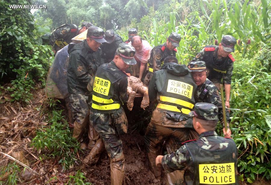 Rescuers and local residents conduct rescue work at the site of a mudslide in Dai-Jingpo Autonomous Prefecture of Dehong, southwest China's Yunnan Province, July 21, 2014. The mudslide happened at around 6 a.m. Monday in Huna Village of Monghai Tow, where 13 houses were crushed and dozens of others damaged. The death toll has risen to 14 and 11 people remain missing, the local government said. (Xinhua/He Donghua)
