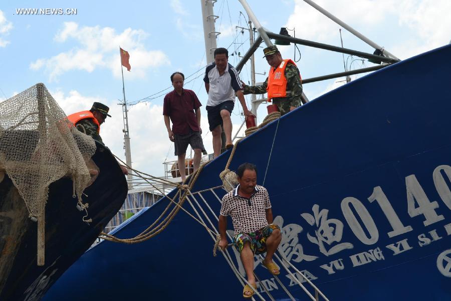 Fishing boats take shelter at the Jinqing Fishing Port to avoid Typhoon Matmo in Taizhou City, east China's Zhejiang Province, July 22, 2014. Typhoon Matmo, the 10th typhoon to affect China this year, was approaching China's southeast coast on Tuesday. (Xinhua/Tao Wenbiao)