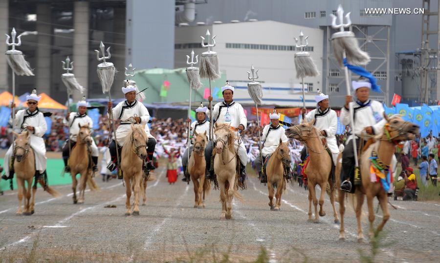 A rider is dressed up for the 23rd Nadam Fair in Bairin Right Banner of Chifeng City, north China's Inner Mongolia Autonomous Region, July 21, 2014. Nadam, which means "entertainment and games" in Mongolian language, has a tradition of more than 700 years. Over 30,000 local residents and visitors will participate in activities like horse racing, archery, Mongolian wrestling, costumes show, art competition, etc. (Xinhua/Zhang Ling)