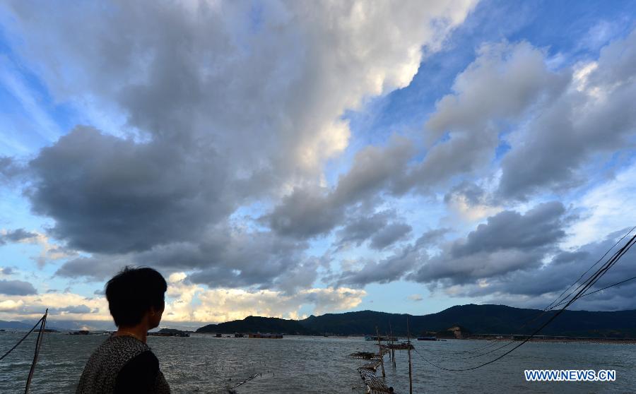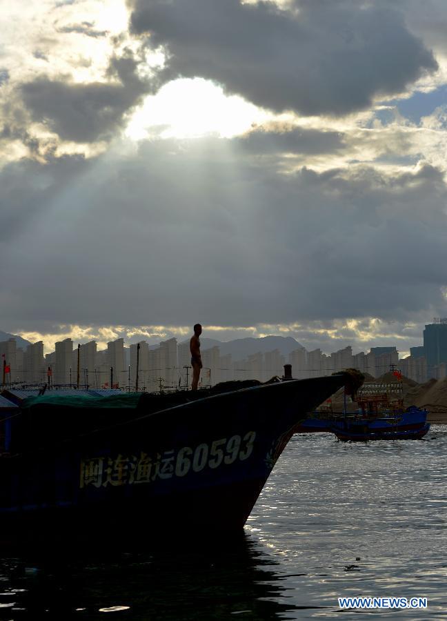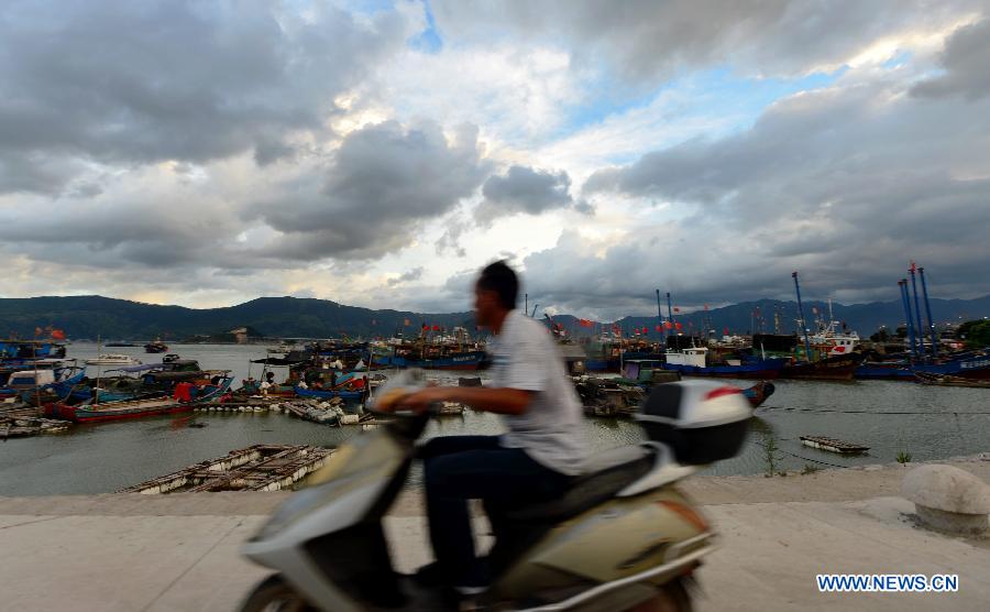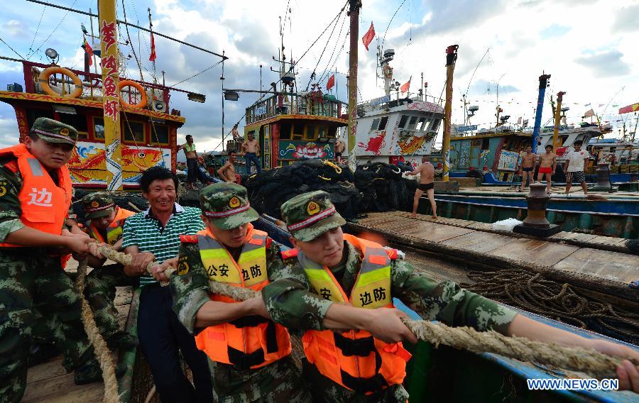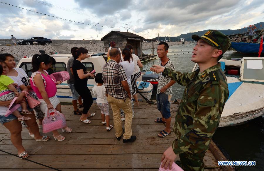 A soldier guides visitors to leave by boat at Luoyuan dock in Fuzhou, southeast China's Fujian Province, July 22, 2014. According to the National Meteorological Center (NMC), typhoon Matmo will make a landfall again in Fujian and Zhejiang provinces between afternoon and night on Wednesday. Local authority has issued the third level alert against the typhoon. (Xinhua/Wei Peiquan)