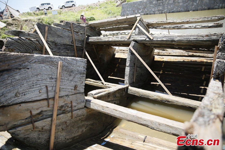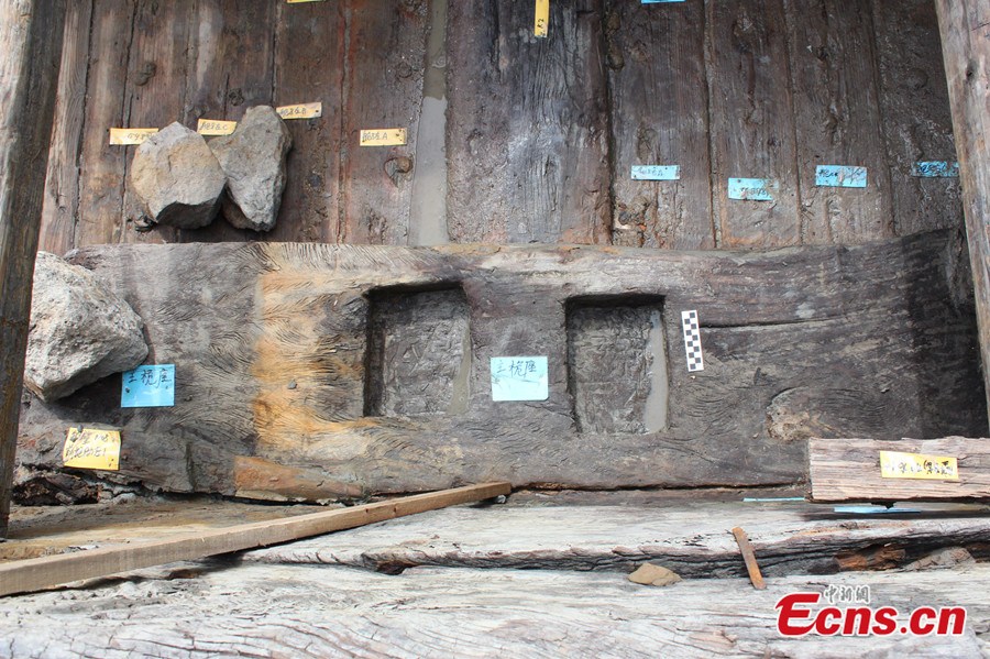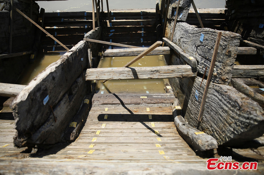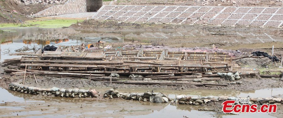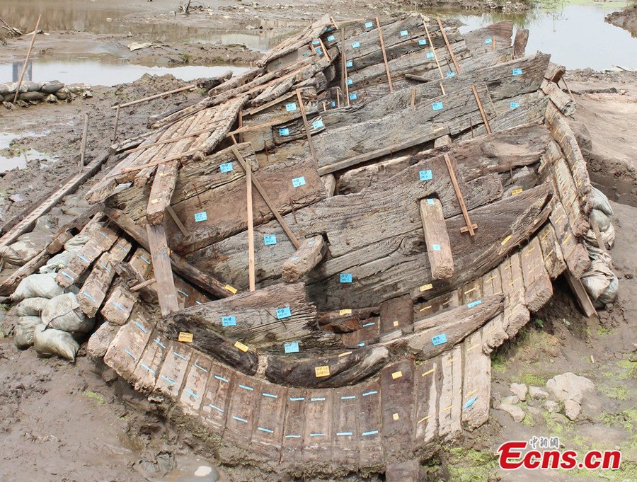 Archaeological excavations of a sunken ship in Chaotang river of Ningbo city, Zhejiang province are made public for the first time on July 22, 2014. The sunken ship of Yuan Dynasty (1271-1368) was unearthed in Cixi city of Ningbo in June this year. Now its field archaeological excavations are completed. The sunken ship wreckage is 19.5 meters long, five meters wide and two meters deep. Its original length is estimated to be between 23 and 28 meters. It's the sixth sunken ship discovered in Ningbo city. [Photo: China News Service / He Jiangyong]