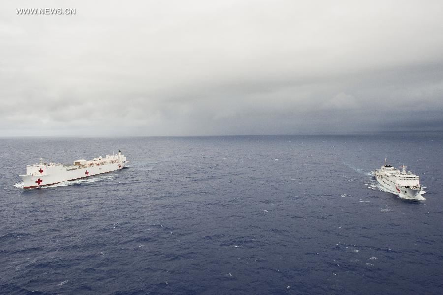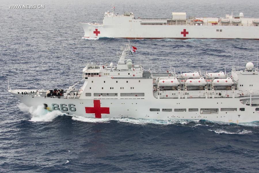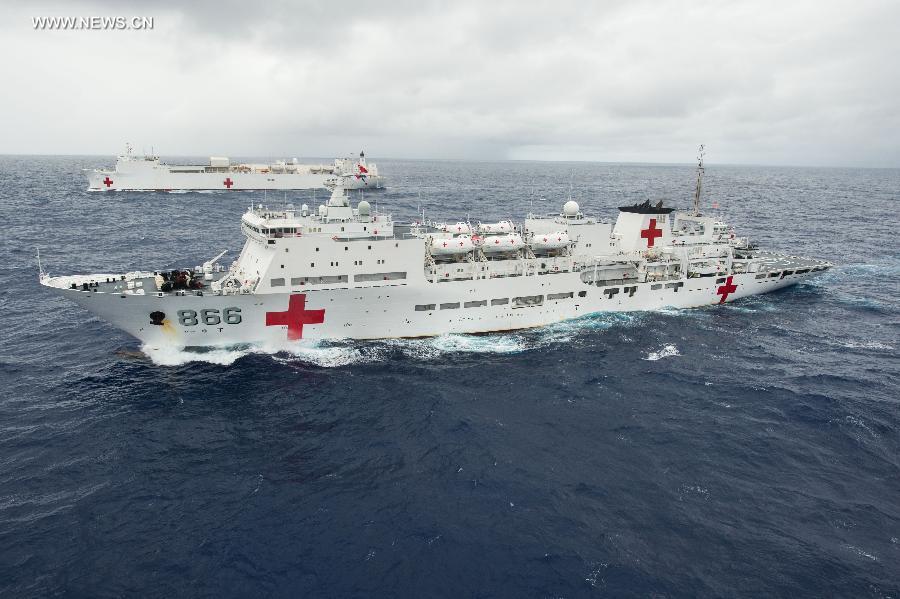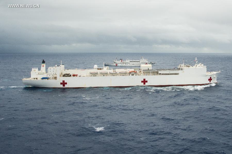 China's hospital ship Peace Ark (Front) and USNS Mercy hospital ship are seen during the Rim of the Pacific (RIMPAC) multinational naval exercises on June 22, 2014. (Xinhua/Qin Haishi)