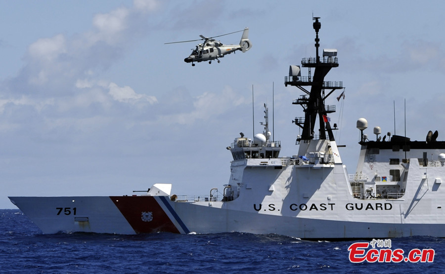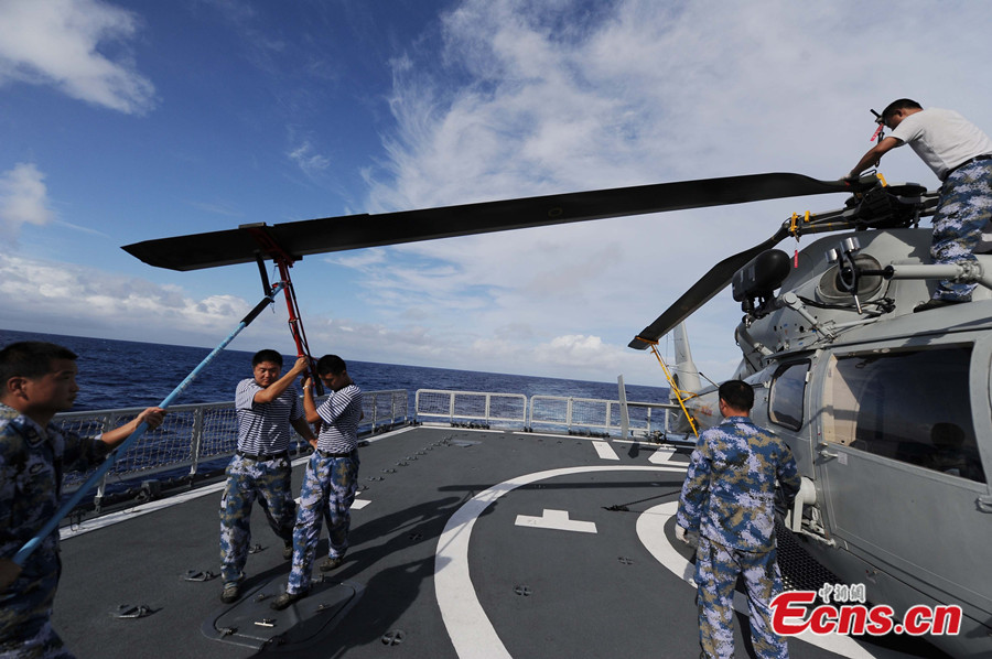 China's ship-borne helicopter is seen during the Rim of the Pacific (RIMPAC) multinational naval drill. China's navy exchanges copter landing experiences with other participating countries in the drill. [Photo: China News Service / Mao Jianjun]