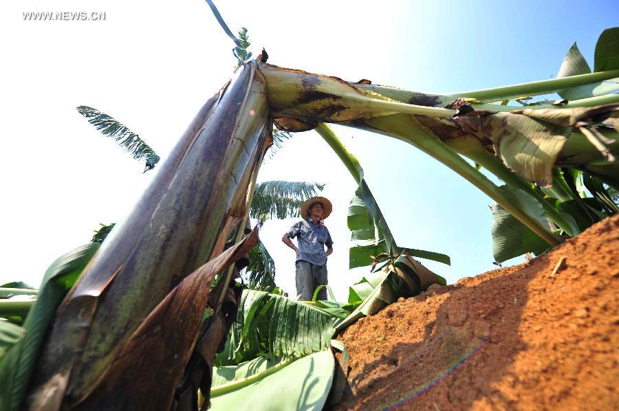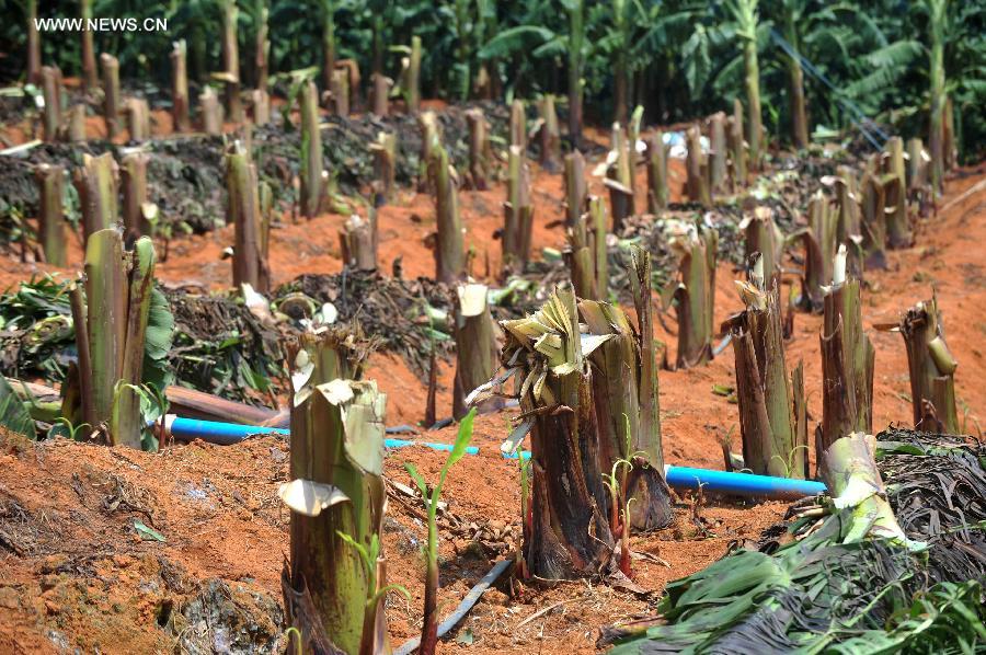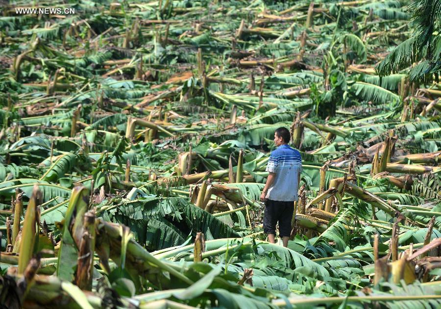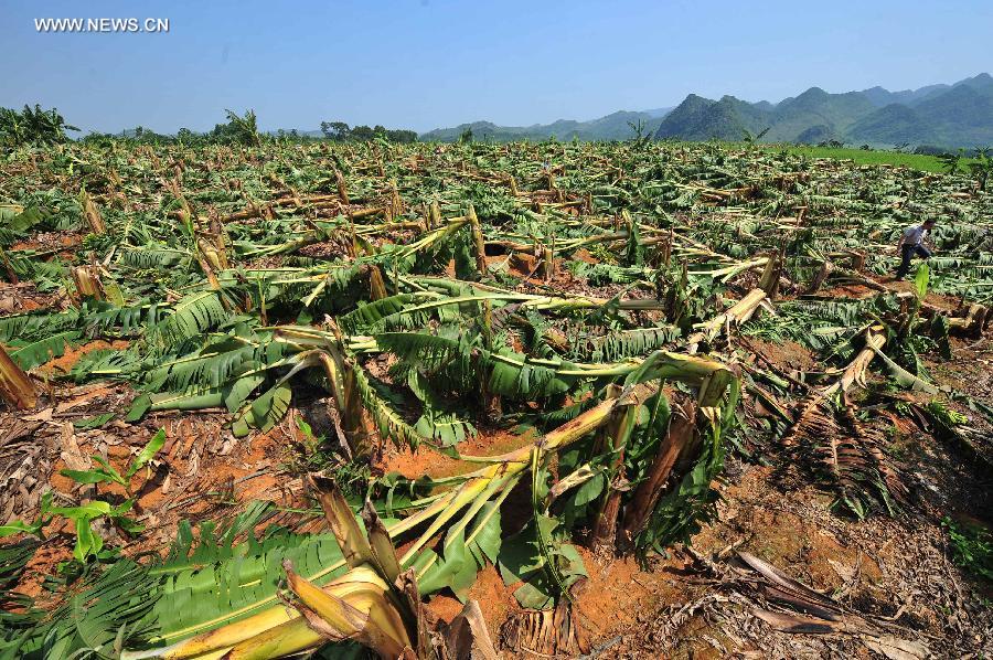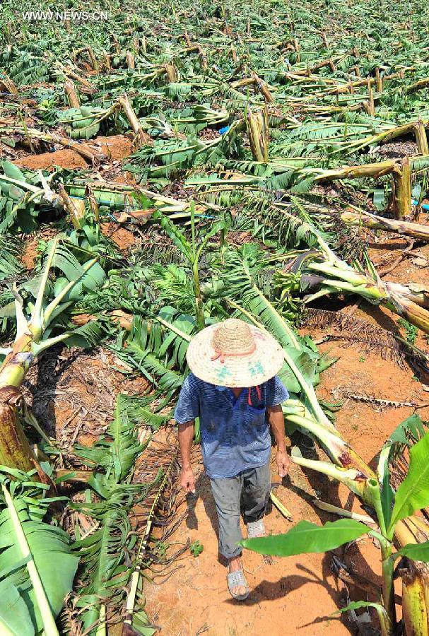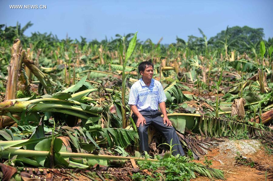 A farmer sits in a field of banana trees which have been blown down by typhoon Rammasun in Wangzhong Village under Chengxiang Town of Long'an County, south China's Guangxi Zhuang Autonomous Region, July 24, 2014. Over 1,455,000 hectares of plants were affected by typhoon Rammasun while about 376,000 hectares failed for harvest.(Xinhua/Huang Xiaobang)