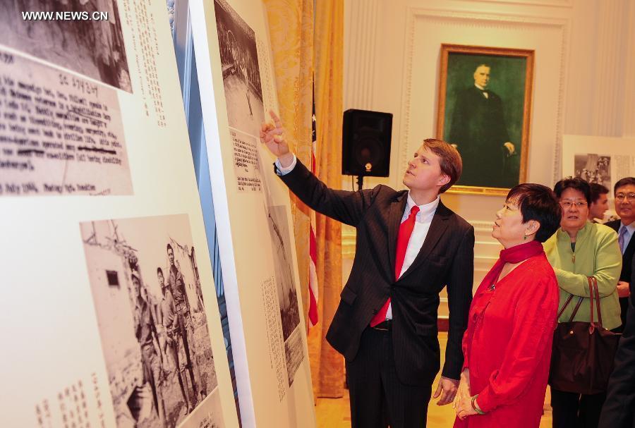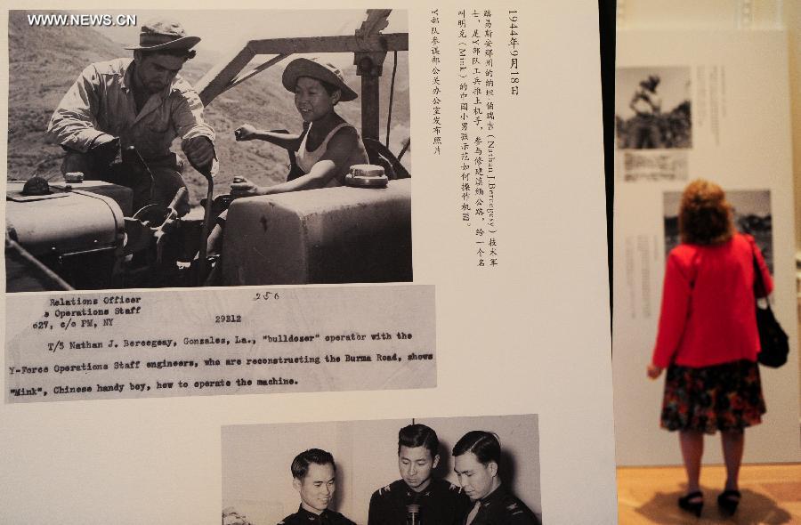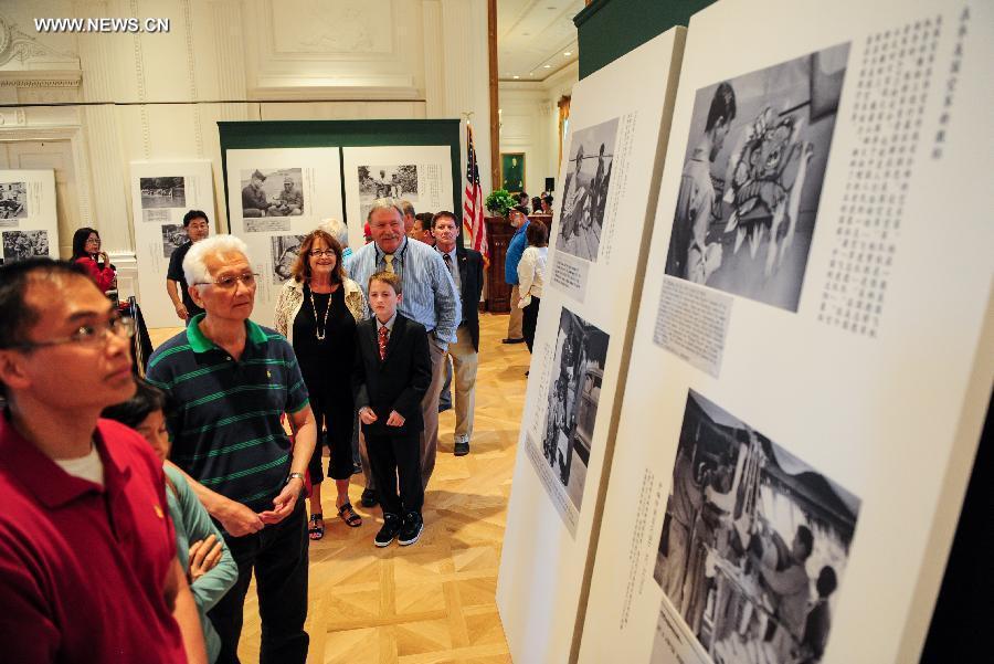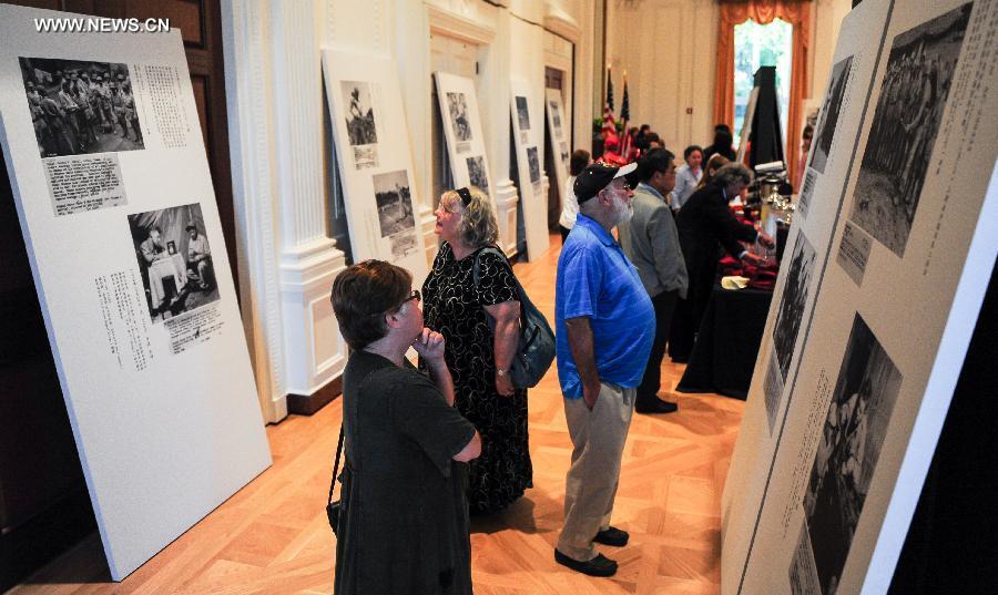 People visit the photo exhibition "Salute to Friendship - Images Narrate China-US Collaboration During World War II" at the Nixon Library in Yorba Linda City of California, the United States, July 23, 2014. The photos were taken by soldiers of the US Army Signal Corps in China during WWII. (Xinhua/Zhang Chaoqun)