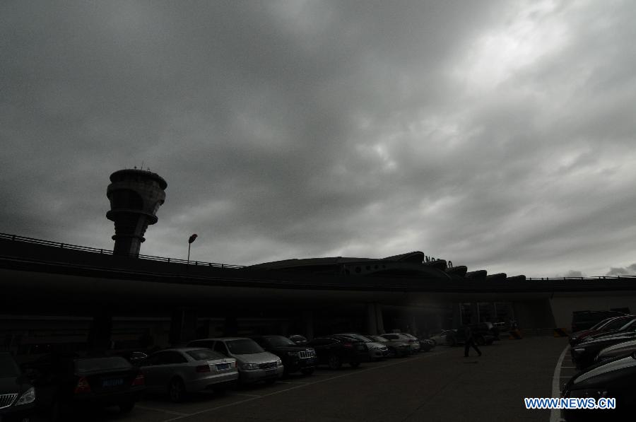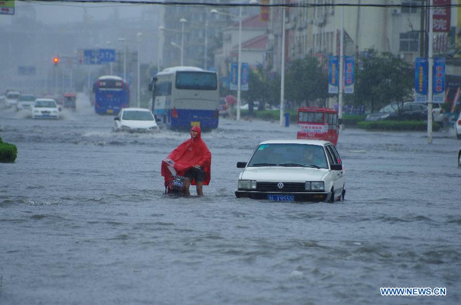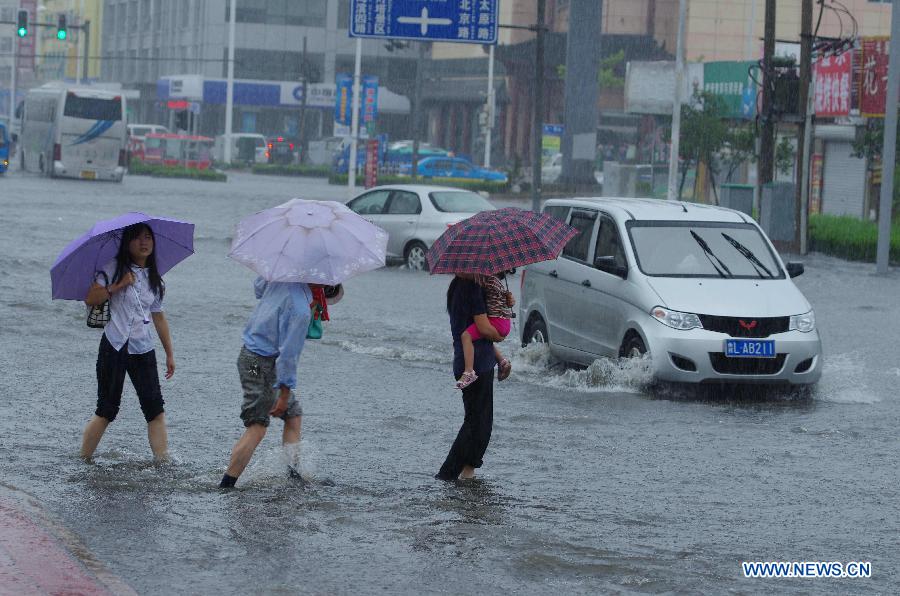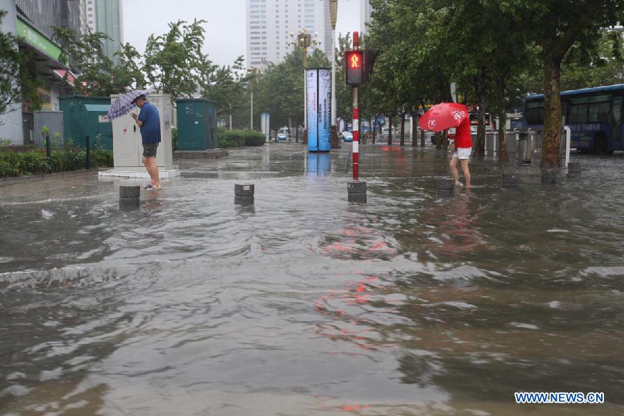 People walk on a waterlogged road in rainstorm in Yantai City, east China's Shandong province, July 25, 2014. Typhoon Matmo brought rainstorms to the province. (Xinhua/Shen Jizhong)