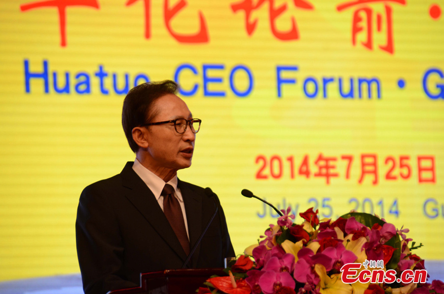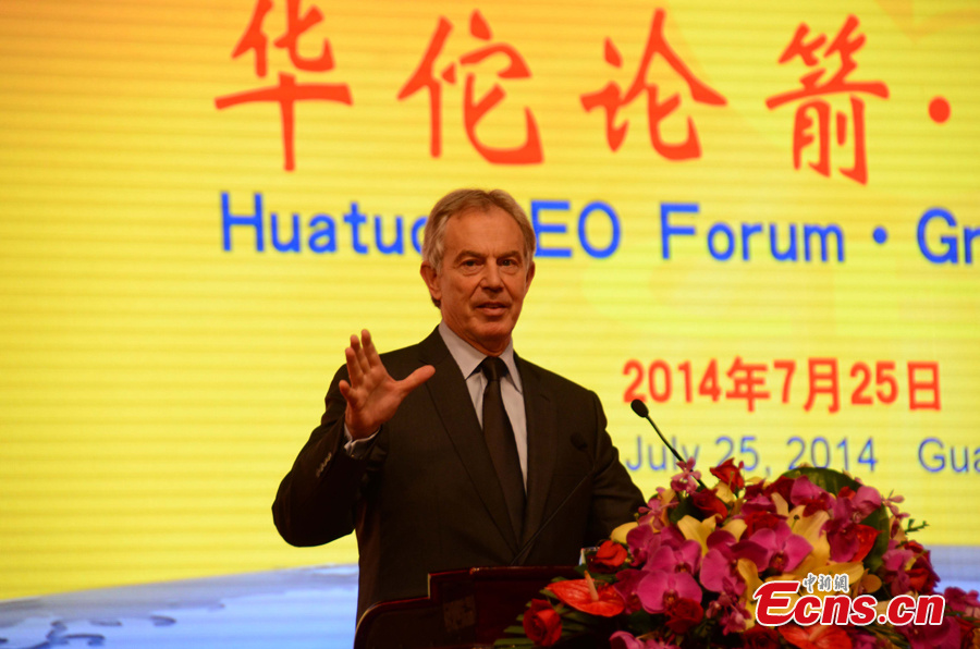 Former UK Prime Minister Tony Blair speaks at the 4th Huatuo CEO Forum under the theme "Multinational Development of Chinese Private Enterprises" in Guangzhou on Friday, July 25, 2014. (Photo: China News Service/ Suo Youwei)