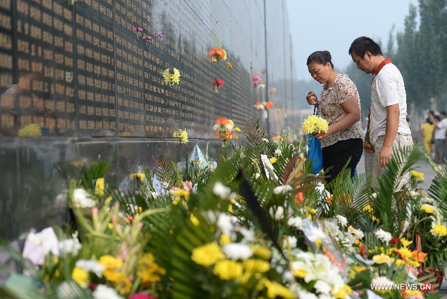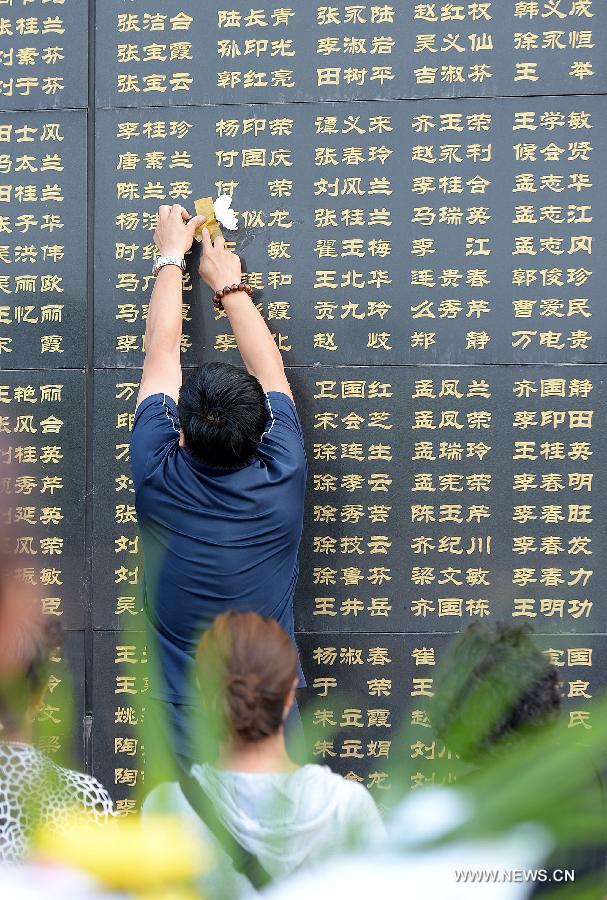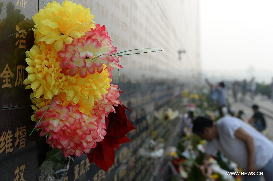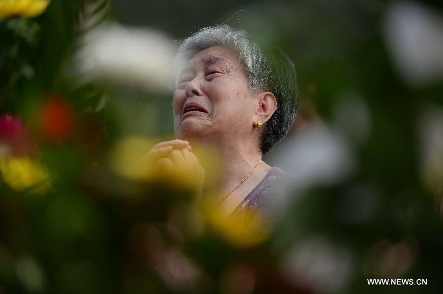 A resident mourns for her relatives died in the 1976 Tangshan earthquake in front of the memorial wall in Tangshan, north China's Hebei Province, July 28, 2014. Local residents came to the memorial park on Monday to commemorate the 38th anniversary of the Tangshan earthquake. (Xinhua/Zheng Yong)