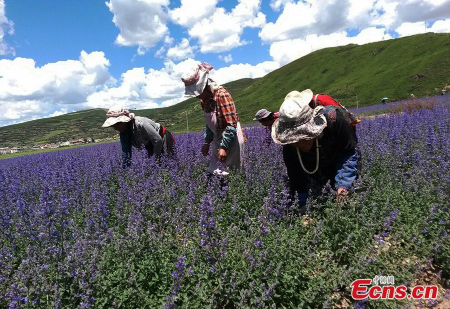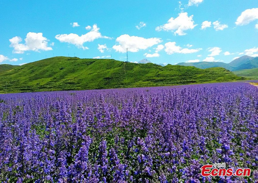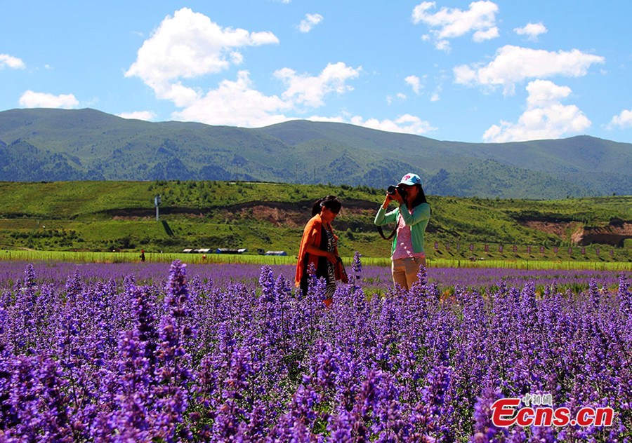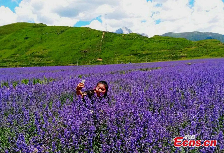A visitor poses for a photo at the lavender field of Chuanzhusi town in Songpan county of southwest China's Sichuan province. Lavender flowers enter blooming season in July in Songpan. [Photo/Yang Zhi]
