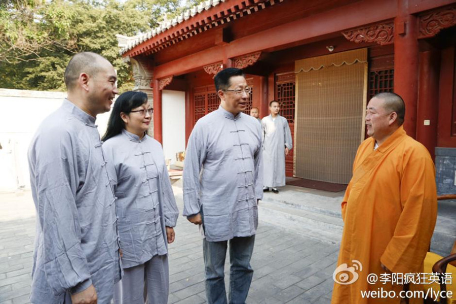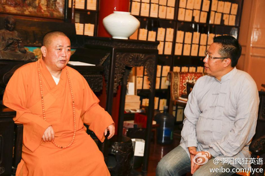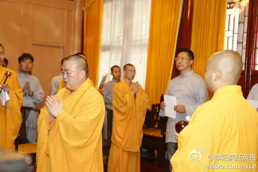 Crazy English Founder Li Yang (R2 front) is apprenticed to Shi Yongxin (C front), abbot of Shaolin Temple, in Dengfeng of Henan province on July 26, 2014. Li's Buddhist name is Yan Yi.[Photo/Sina Weibo]