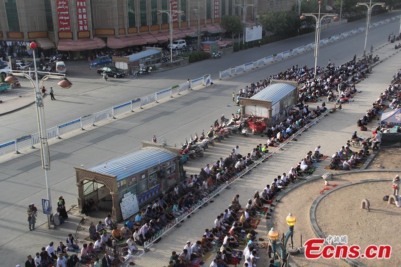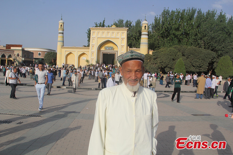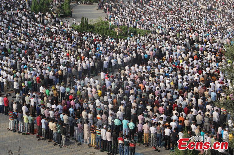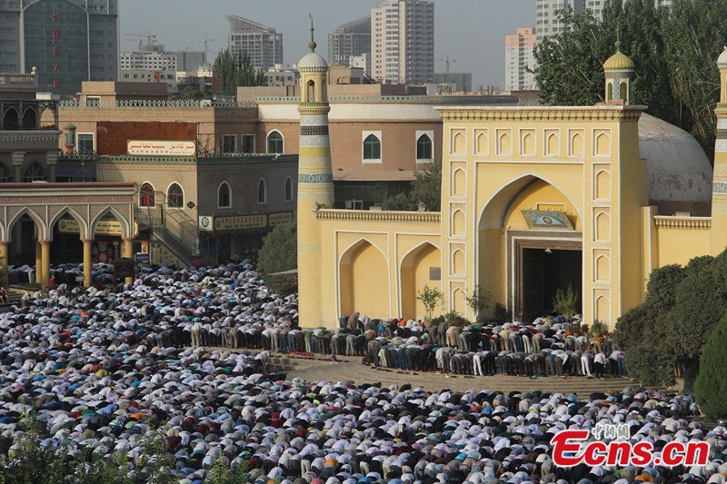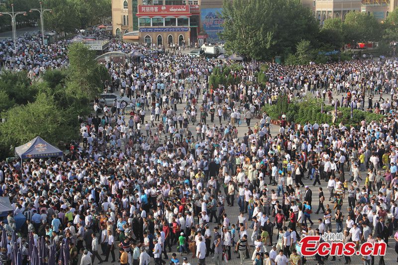 Muslims gather to celebrate Eid al-Fitr that marks the end of the Islamic holy month of Ramadan at Id Kah Mosque in Kashgar of northwest China's Xinjiang Uygur autonomous region on July 29, 2014. Id Kah Mosque is the largest mosque in China. [Photo/Zhu Jingchao]