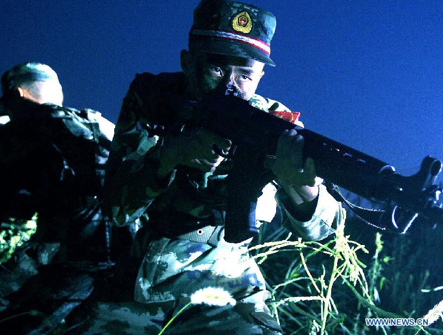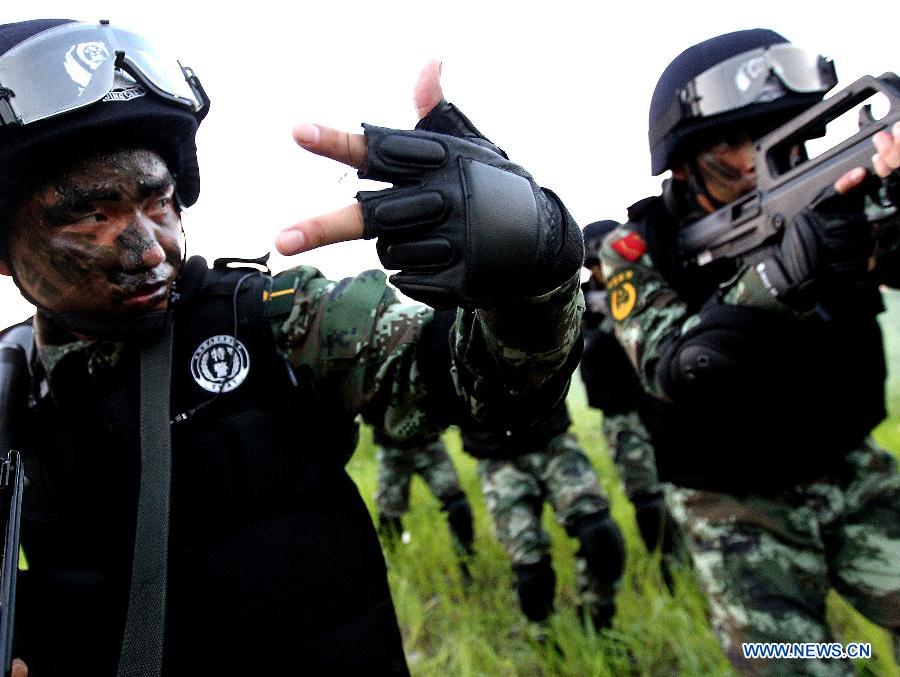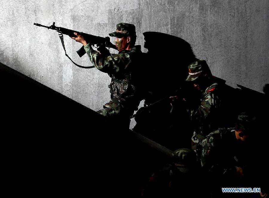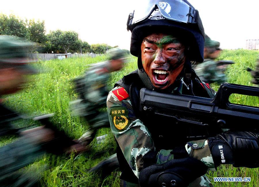 Armed policemen of the third detachment of Shanghai Armed Police Corps take part in a combat exercises in Shanghai, east China, July 30, 2014. (Xinhua/Chen Fei)
