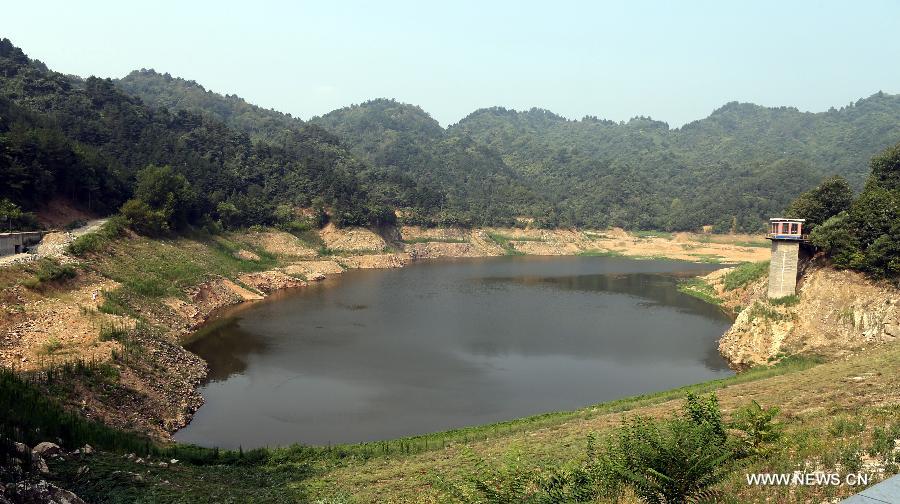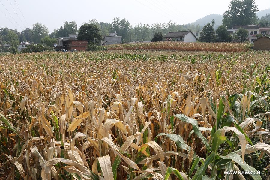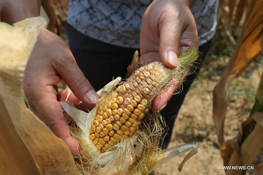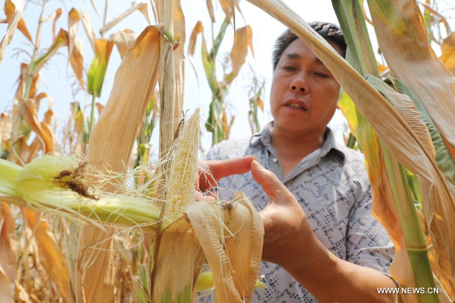 Zhang Chuanzhen, head of local husbandry station, checks withered corn in Guofenglou Town in Shangnan County, northwest China's Shaanxi province, July 30, 2014. Shangnan County has suffered from drought since late July. (Xinhua/Mu Jialiang)