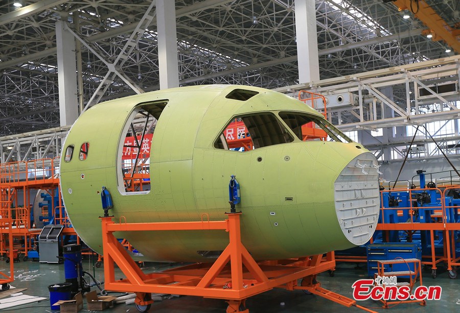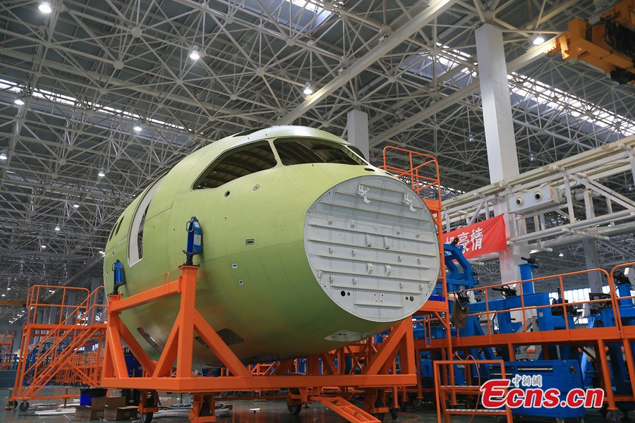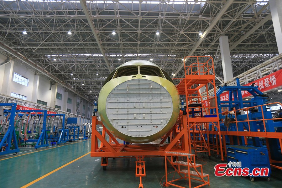 The nose part of C919, China's largest domestically produced aircraft, has rolled off the production line in Chengdu on July 31, 2014. Final assembly of the plane is expected later this year and its producer has received 400 orders. [Photo: China News Service / Wang Jiliang]