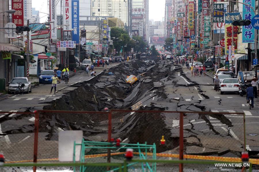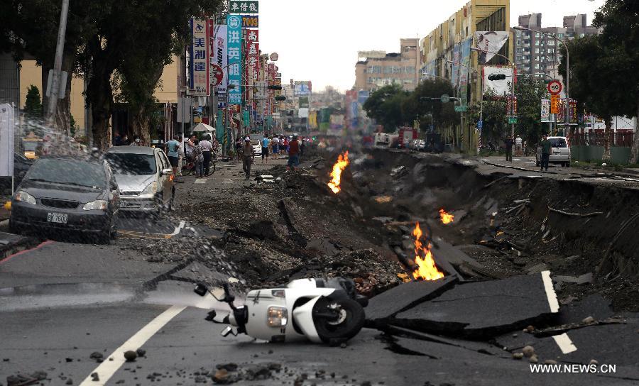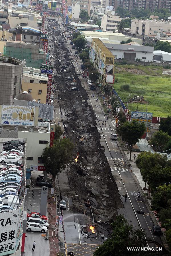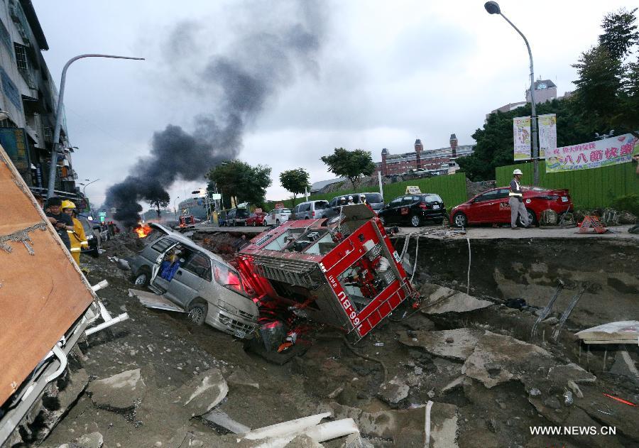 Photo taken on Aug. 1, 2014 shows the site of gas leak explosions in Kaohsiung, southeast China's Taiwan. The local fire-fighting authority said gas leaks were reported in the city's Cianjhen district at around 8:46 p.m. Thursday, leading to multiple explosions that affected an area as large as three square kilometers. Death toll from the gas leak explosions has climbed to 24 by 9 a.m on Friday, meanwhile, 271 others were injured. (Xinhua)