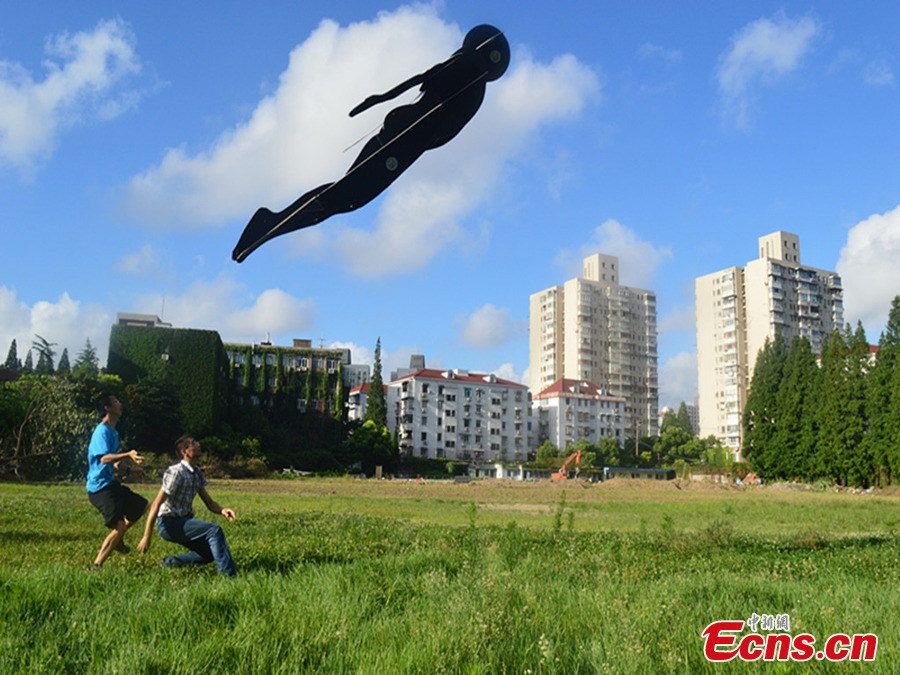 Students from Tongji University fly a human-shaped aircraft in Shanghai on Thursday, July 31, 2014. The 3.5-meter-long object in the the sky is a remotely controlled micro air vehicle (MAV) designed by students to take part in the university's MAV competition. (Photo: China News Service/ Xu Jing)