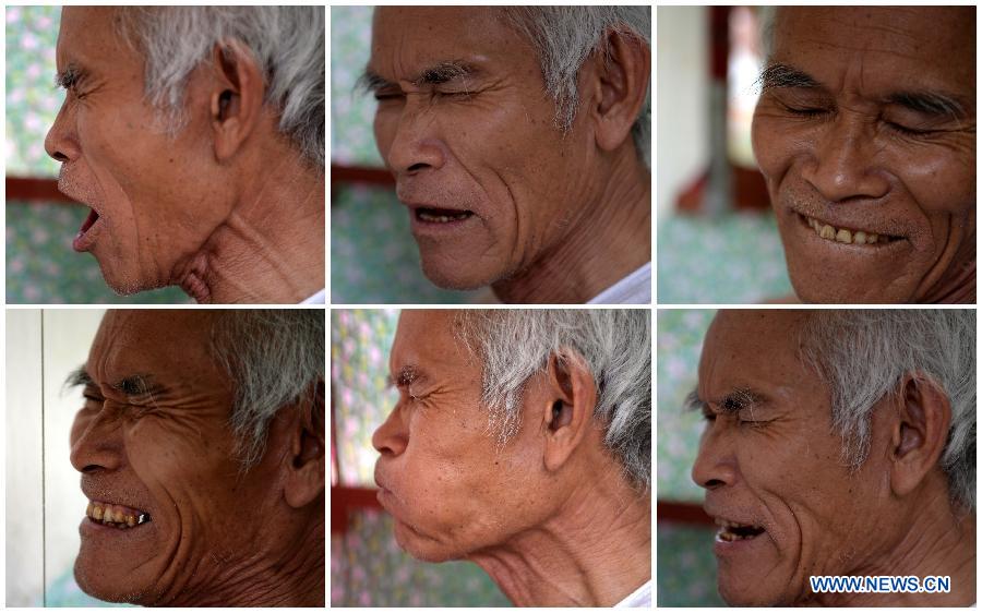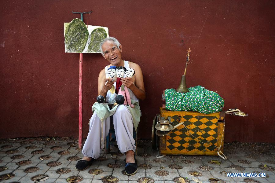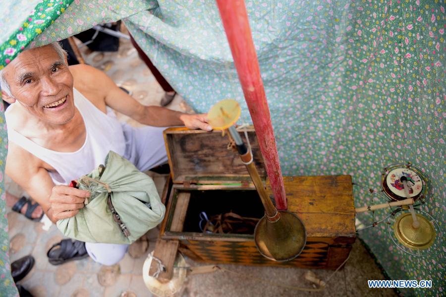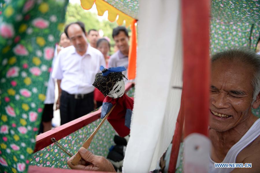 Puppeteer Xiao Qiulin presents his puppets for a show in Yudu County, east China's Jiangxi Province, Aug. 1, 2014. Xiao, 65, started making a living by performing puppet shows for local residents since his twenties. With a stage enclosed by a piece of cloth, a set of instruments and several puppets, Xiao could perform a show for his audience all by himself. Now Xiao has recruited several apprentices, hoping that one day he could build a puppet troupe and his craftsmanship could be carried forward. (Xinhua/Chen Zixia)