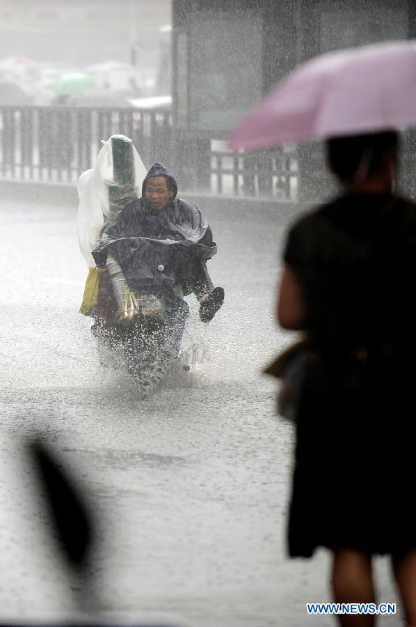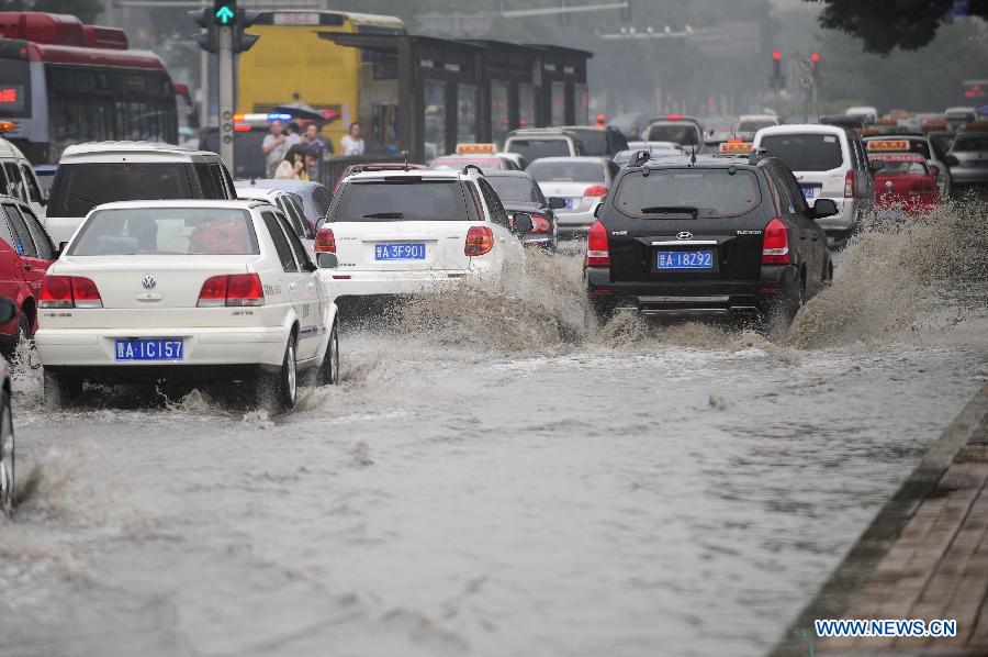 Cars drive on a waterlogged road in Taiyuan, capital of north China's Shanxi province, Aug 4, 2014. Heavy rainfall hit the city on Monday. (Xinhua/Fan Minda)