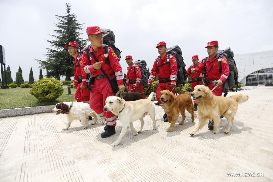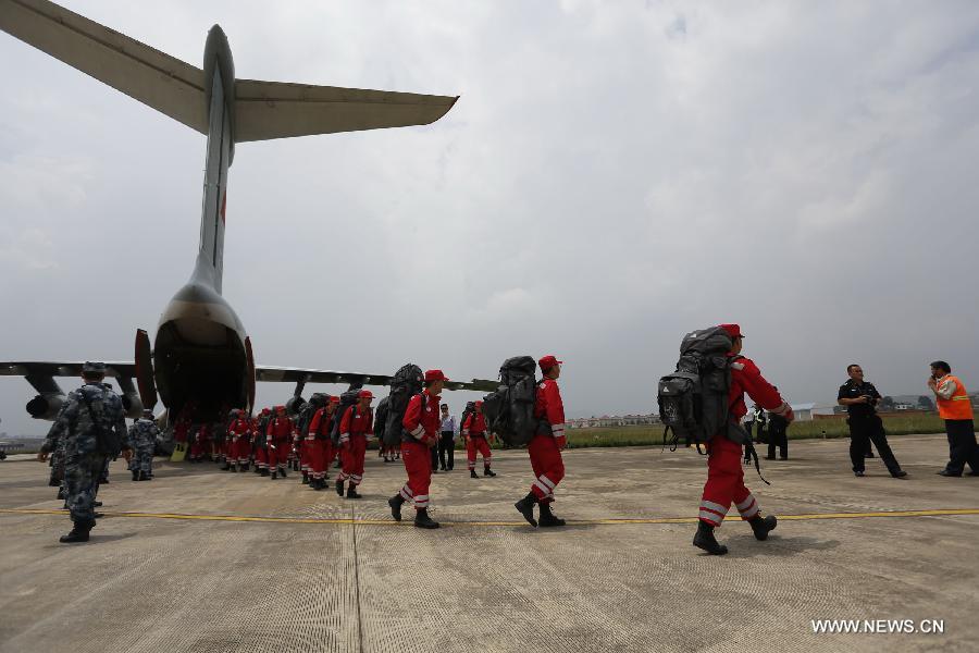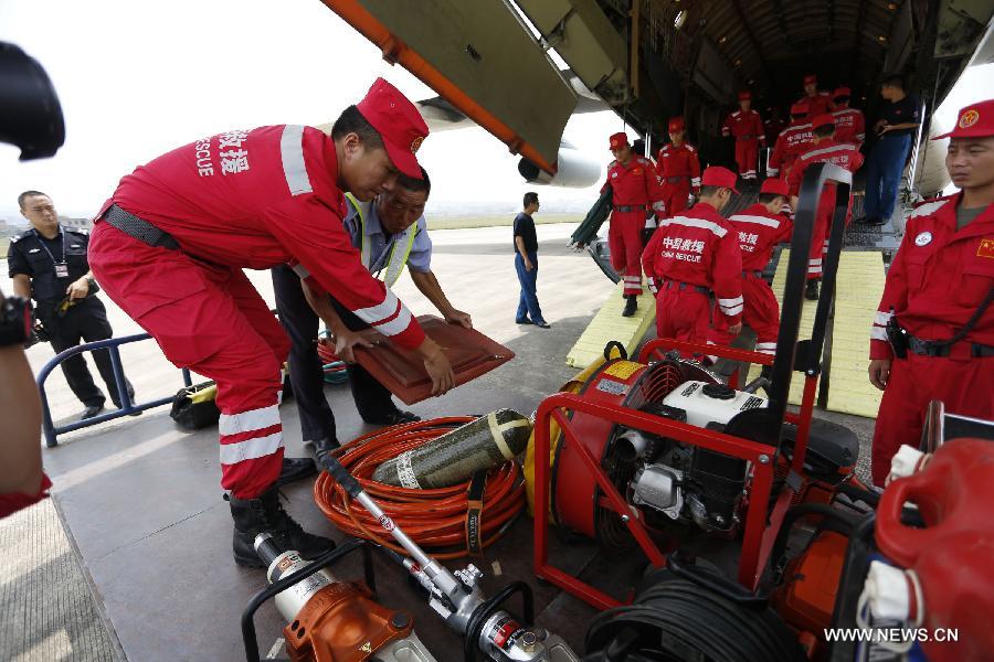 Members of China International Search and Rescue Team (CISAR) unload relief materials and rescue equipment from an aircraft in Zhaotong, southwest China's Yunnan province, Aug 4, 2014. A total of 100 rescuers of the CISAR and 8 sniffer dogs flew from Beijing, capital of China, and arrived in the earthquake-hit Zhaotong on Monday. (Xinhua/Min Zhong)