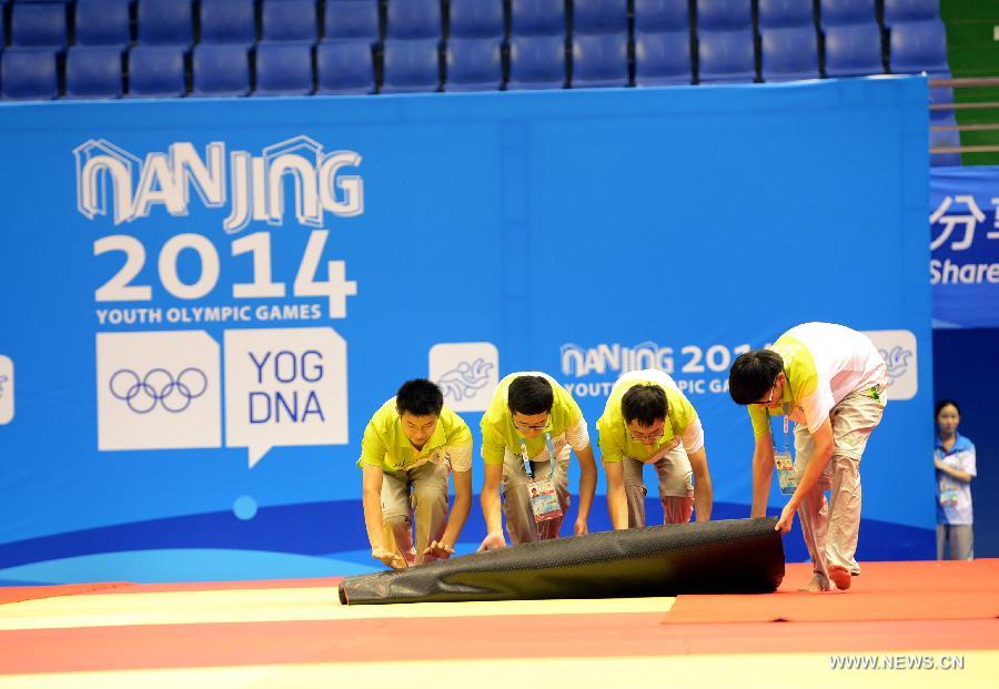 Volunteers for protocol walk in a line during the volunteer training for the 2nd Summer Youth Olympic Games at Longjiang Gymnasium in Nanjing, China on Aug. 4, 2014. Volunteers for protocol, spectator services, broadcast and material management are receiving intensified practical training for the upcoming Youth Olympic Games in Nanjing. (Xinhua/Sun Can)
