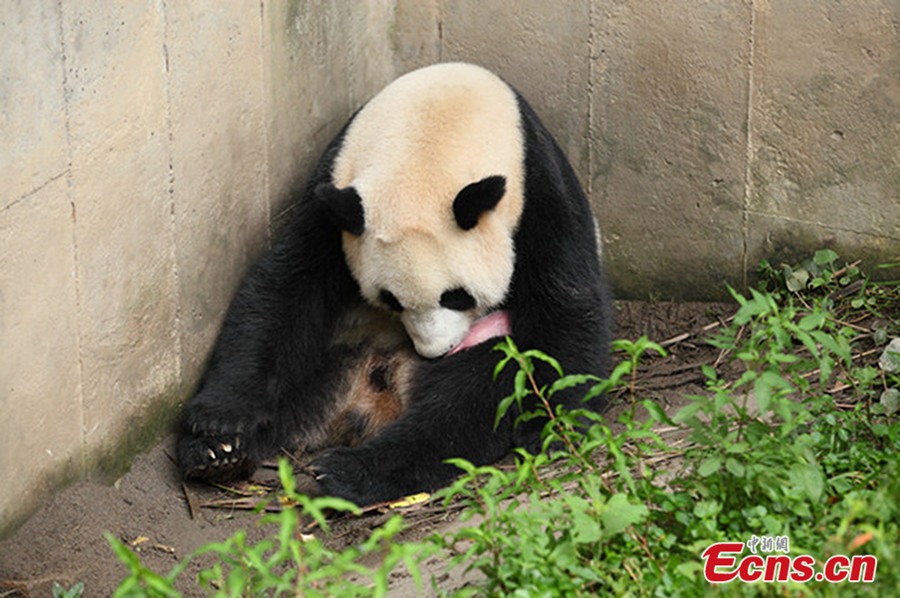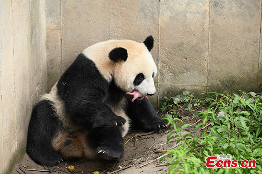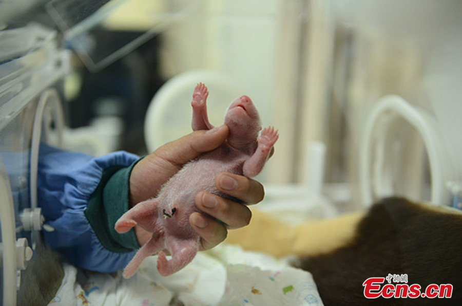 The giant panda Su Lin holds her newborn cub in mouth at Bifengxia Base of the China Giant Panda Protection and Research Center in Ya'an, Sichuan province. Su Lin gave birth to the twins on August 3, 2014. The two cubs are the first twin pandas born in the China Giant Panda Protection and Research Center since the beginning of this year. Su Lin was born in August 2005 at San Diego Zoo in the United States and returned to China in 2010. [Photo: China News Service/ Luo Bo]