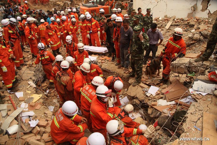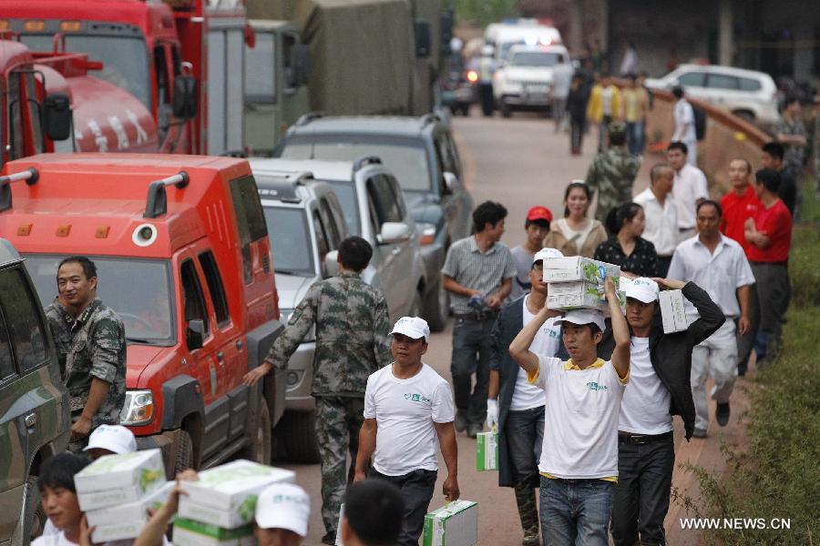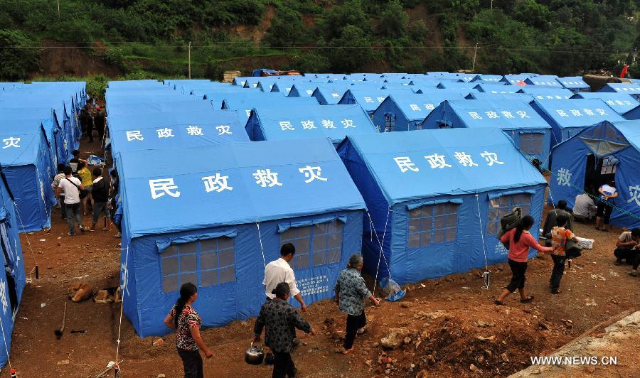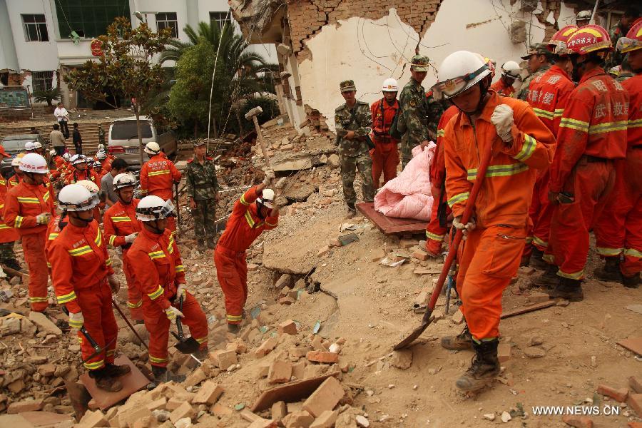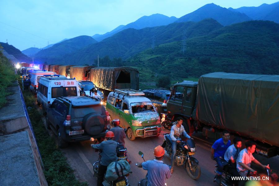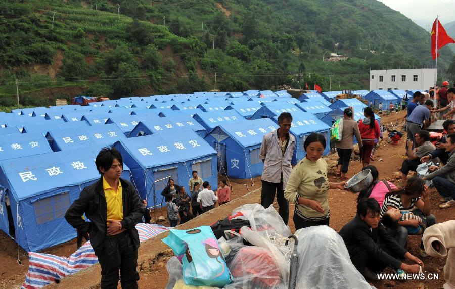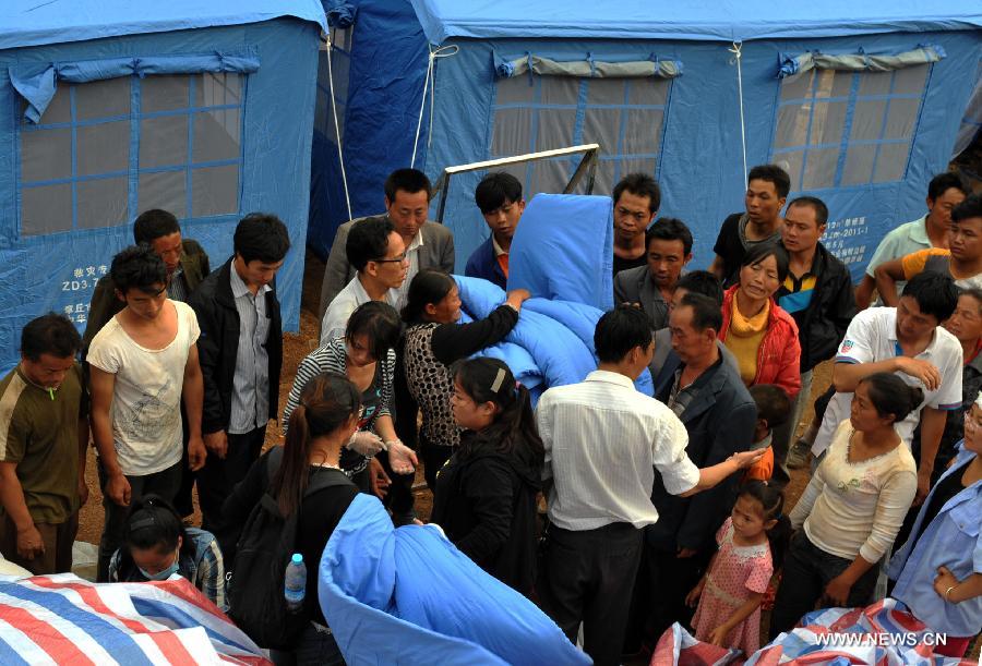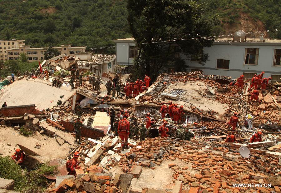 Medical staff work at a temporary medical station after an earthquake in Longtoushan township of Ludian county, southwest China's Yunnan Province, Aug. 4, 2014. At least 398 people have been killed after a 6.5-magnitude earthquake rattled the province Sunday afternoon. (Xinhua/Chen Haining)