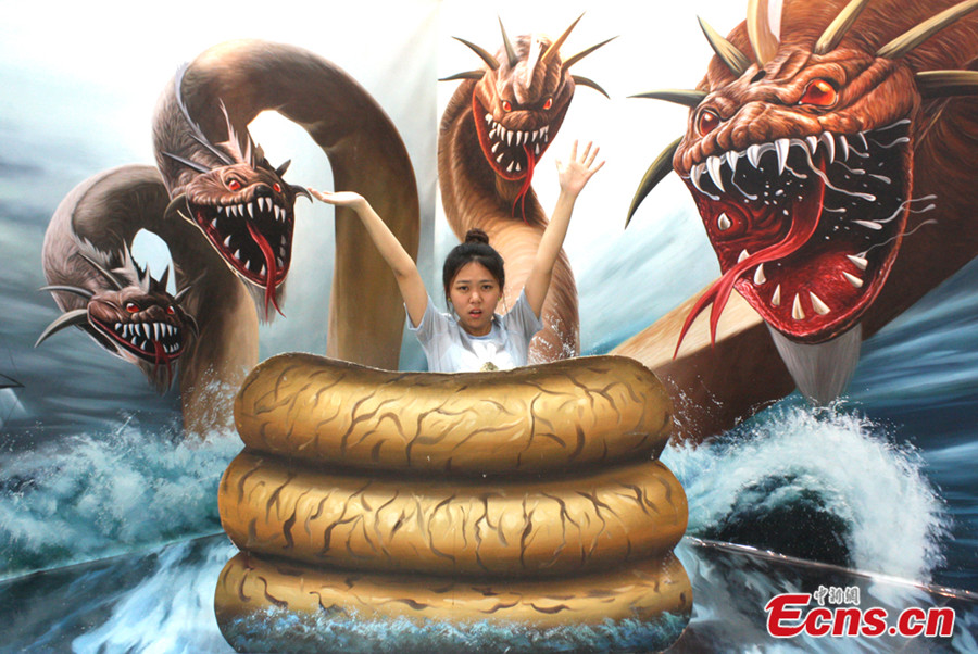 A visitor poses for a photo at a 3D painting exhibition at Yancheng city of east China's Jiangsu province on August 4, 2014. The exhibition, first of its kind in the city, displays over 70 3D paintings. [Photo/Gu Hua]