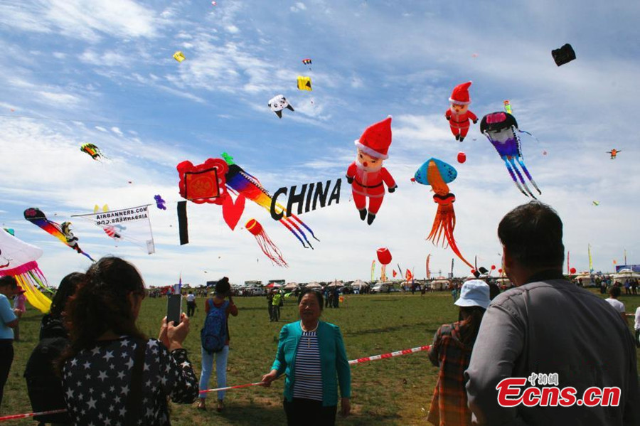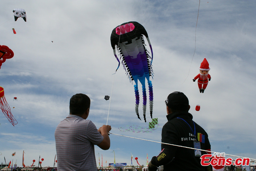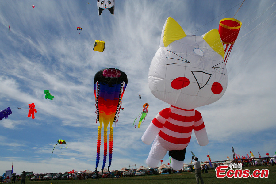 A kite festival kicks off at Xilamuren Grassland, 90 kilometers north of Hohhot city, in north China's Inner Mongolian autonomous region on August 5, 2014. A total of 35 teams from home and abroad participate in the two-day 2014 Hohhot First Kite Festival. [Photo/Wu Yana]
