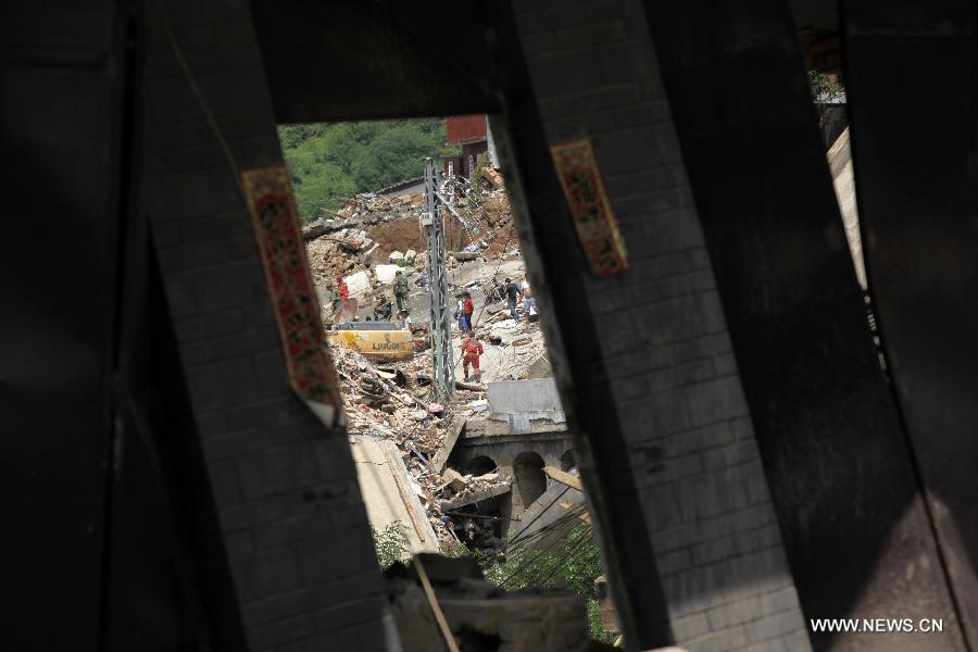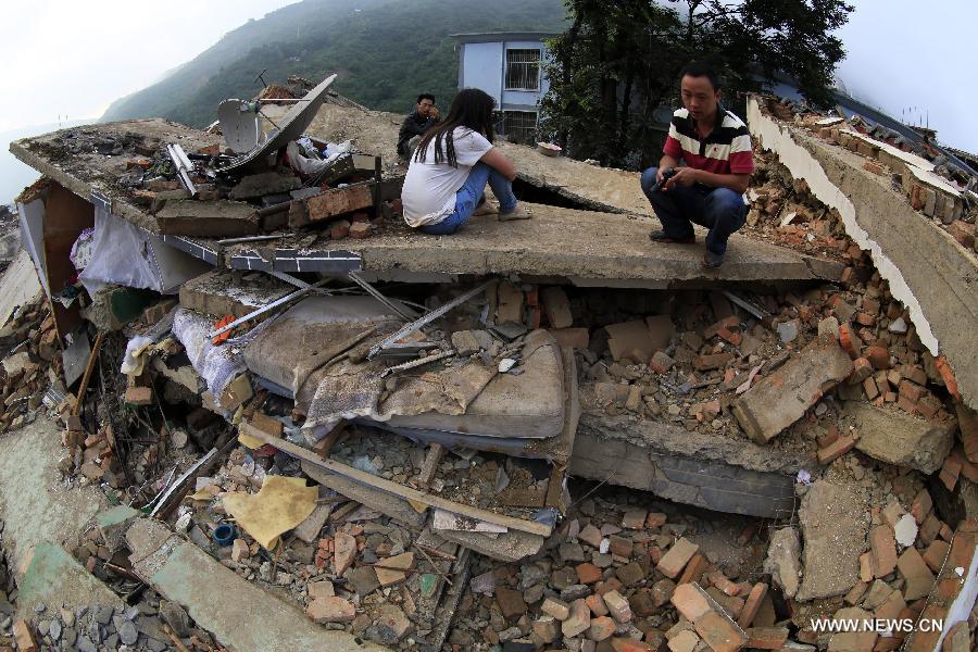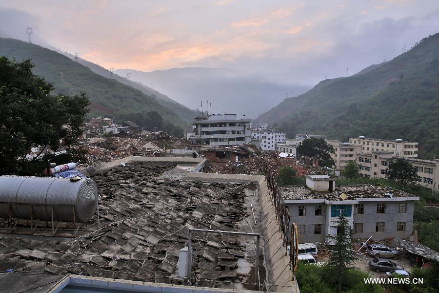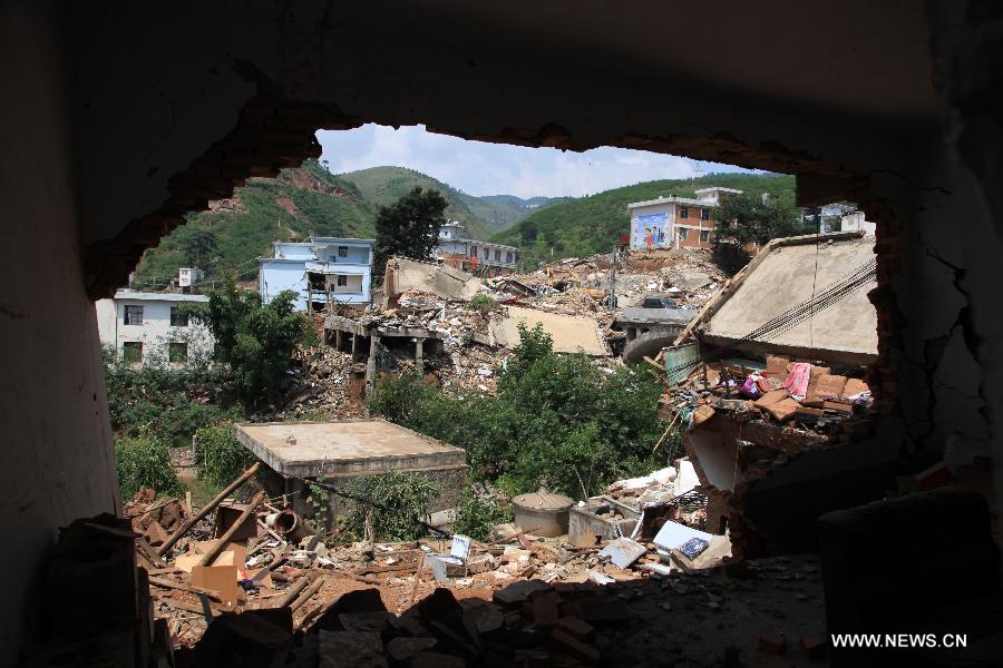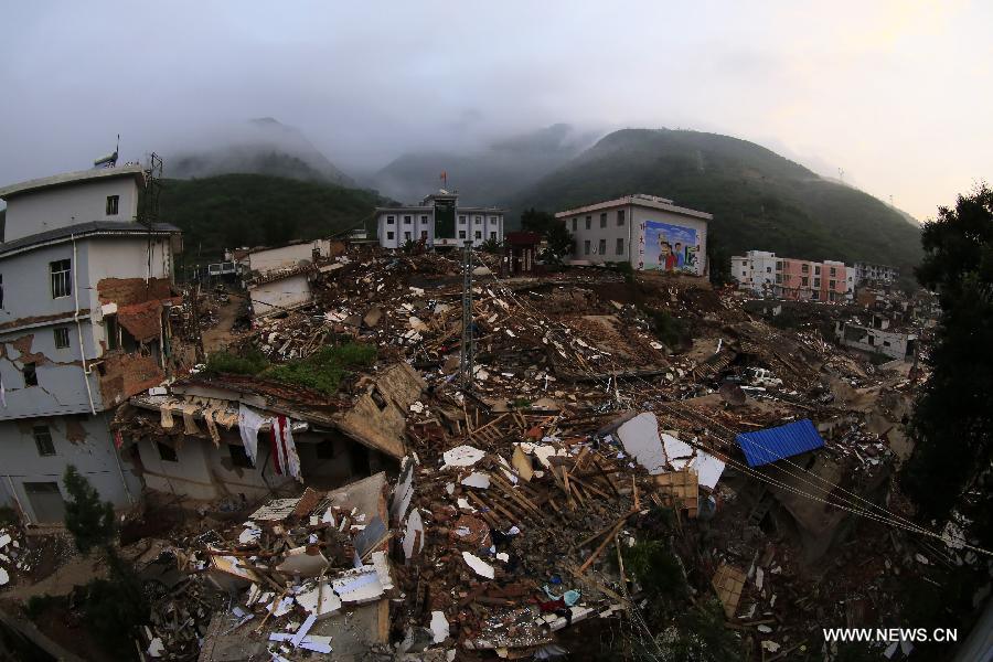 Photo taken on Aug. 5, 2014 shows damaged houses after a 6.5-magnitude earthquake in Longtoushan Township of Ludian County, southwest China's Yunnan Province. The 6.5-magnitude earthquake that struck Yunnan's Ludian County on Sunday afternoon has left at least 410 people dead, 12 missing and more than 2,300 others injured. (Xinhua/Zhang Guangyu)