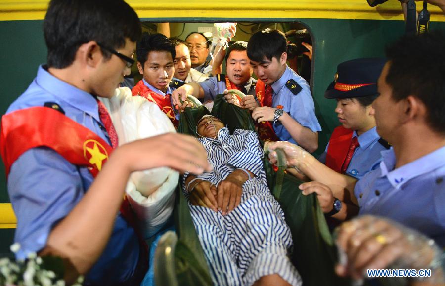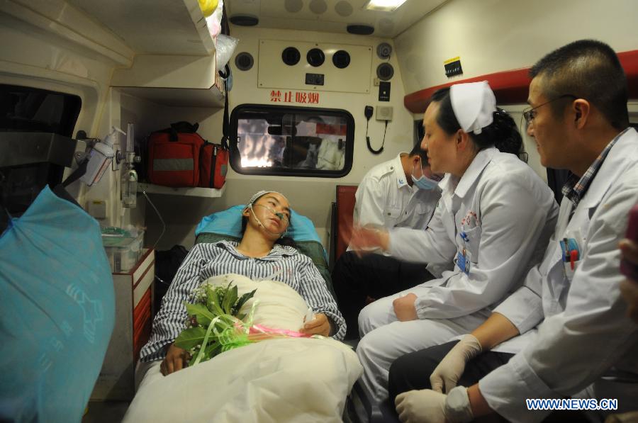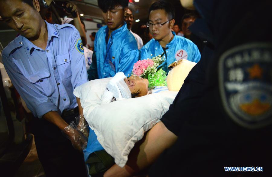 A baby injured in quake-hit area is helped to wear oxygen mask after arriving at the Kunming Railway Station in Kunming, capital of southwest China's Yunnan Province, Aug. 5, 2014. The 6.5-magnitude earthquake that struck Yunnan's Ludian County on Sunday afternoon has left at least 410 people dead. (Xinhua/Hou Wenkun)