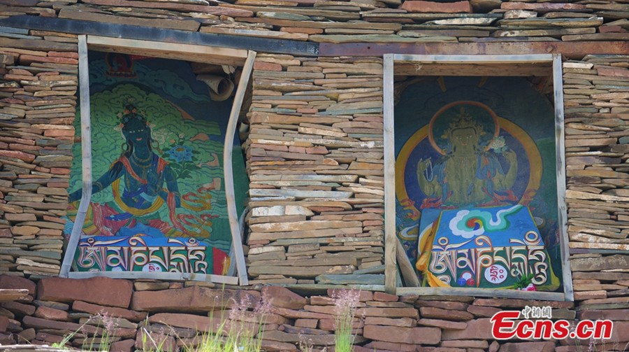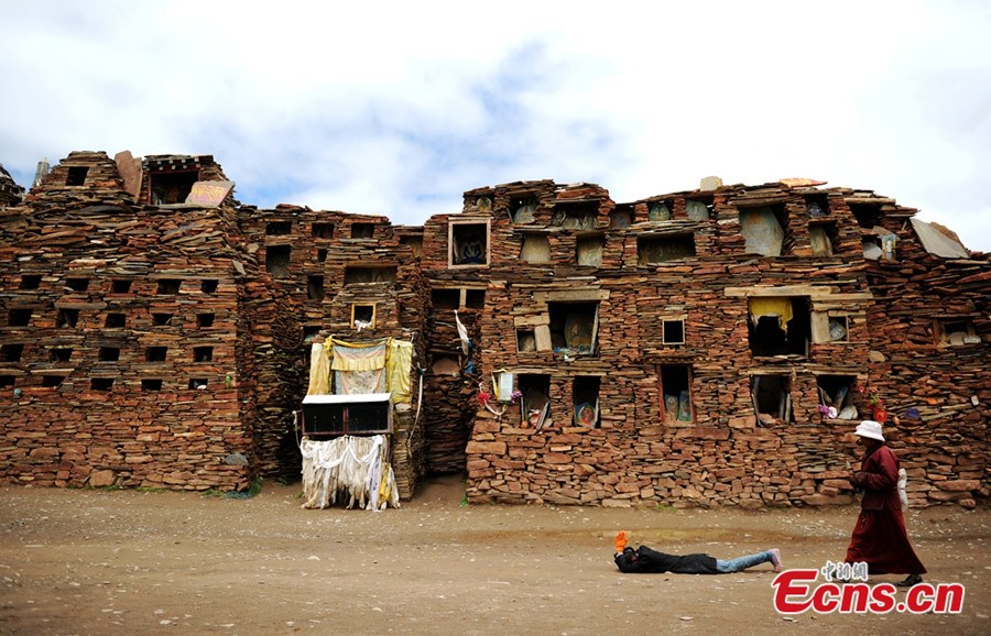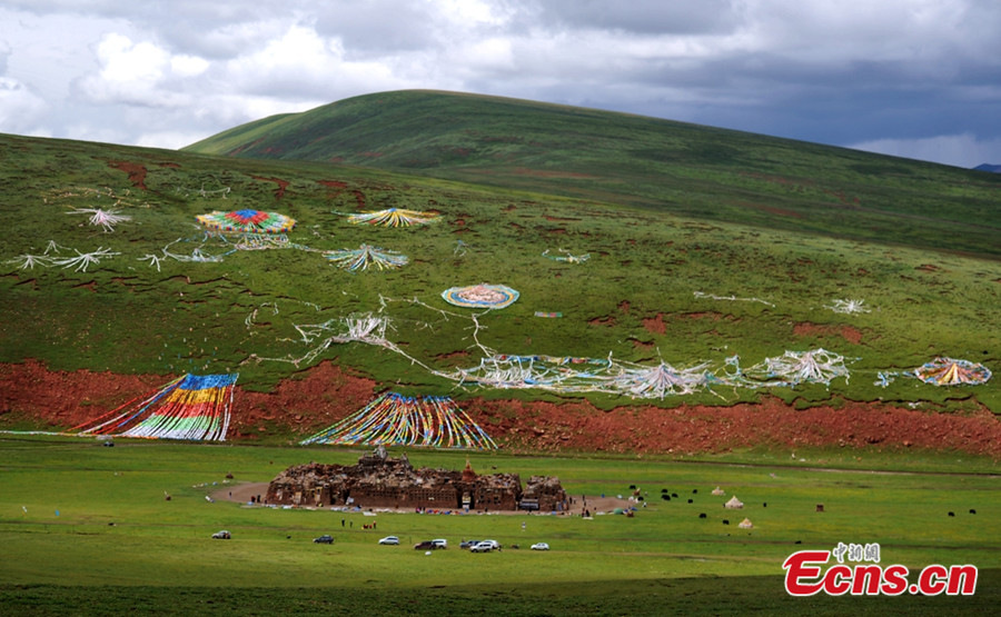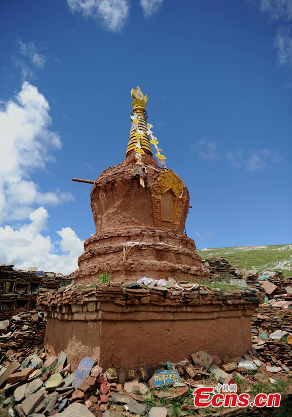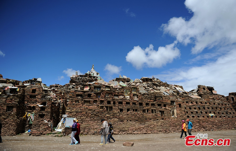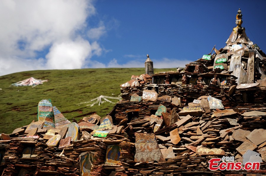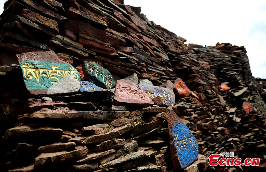Songge Mani Stone Mound is located at Arizha township of Shiqu county in Ganzi Tibetan autonomous prefecture of southwest China's Sichuan province. The stone mound's width is 47 meters and length is 73 meters, with its highest point reaching 15 meters. When the mound was built and by whom are still riddles to be deciphered. Mani stones are stone plates, rocks and/or pebbles, inscribed with the six syllabledmantra of Avalokiteshvara (Om mani padme hum, hence the name "Mani stone"), as a form of prayer in Tibetan Buddhism. Images of deities and great adepts and sutra texts are also common themes. [Photo/Liu Zhongjun]