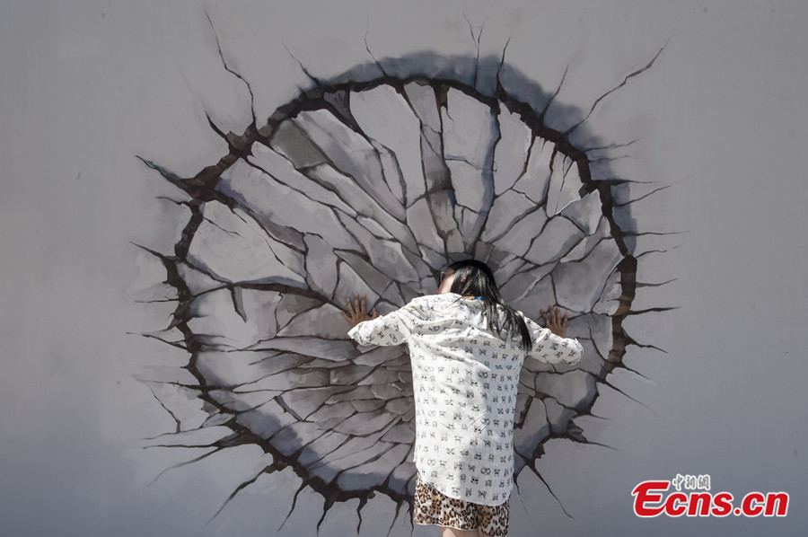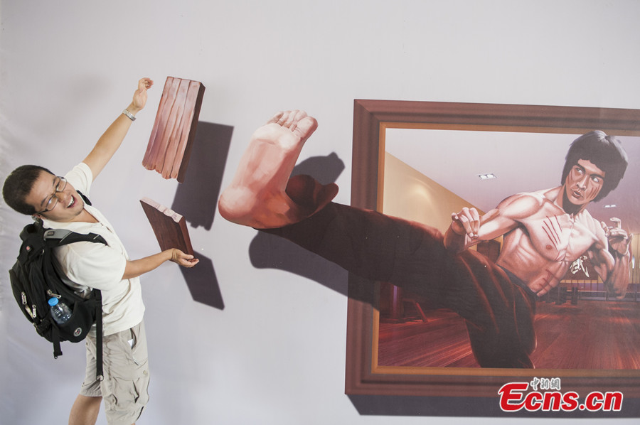 A visitor poses for a photo at a 3D exhibition at the square in front of the Central Radio & TV Tower in Beijing on August 6, 2014. The exhibition, covering an area of 15,000 square meters, displays over 230 3D paintings. As largest of its kind in China, it will last nearly 100 days. [Photo: China News Service / Cui Nan]
