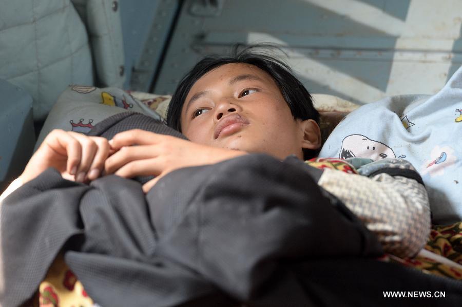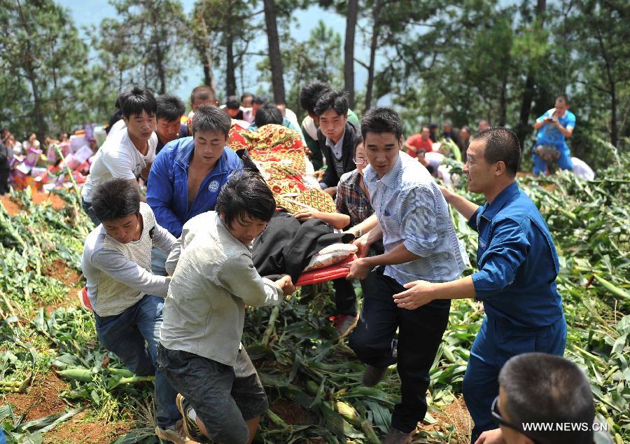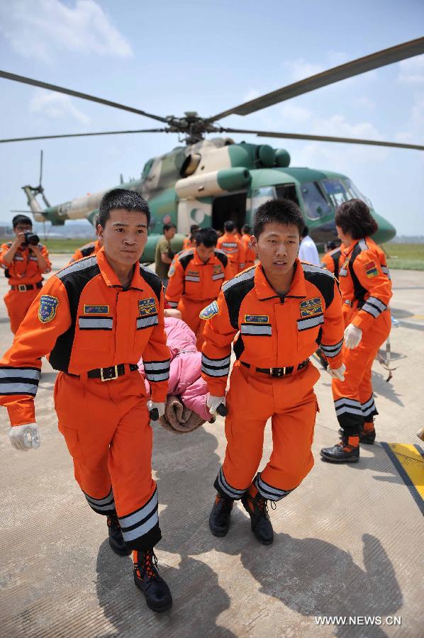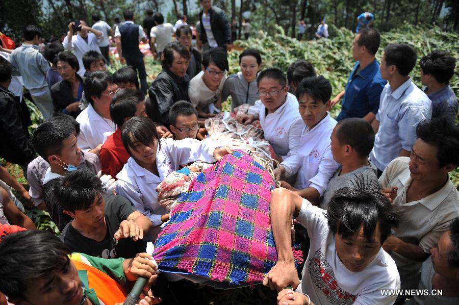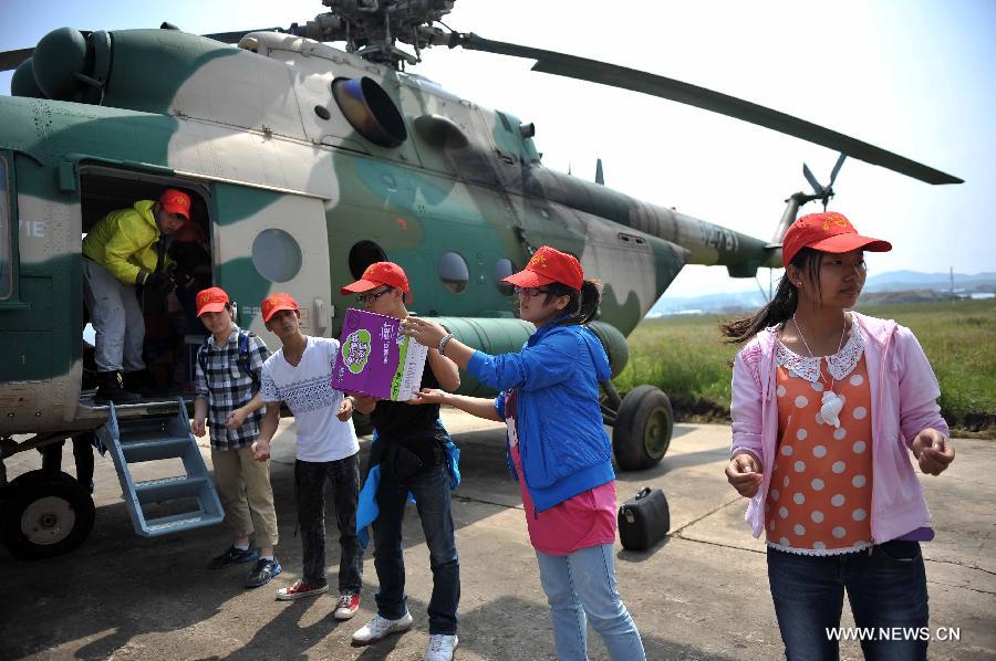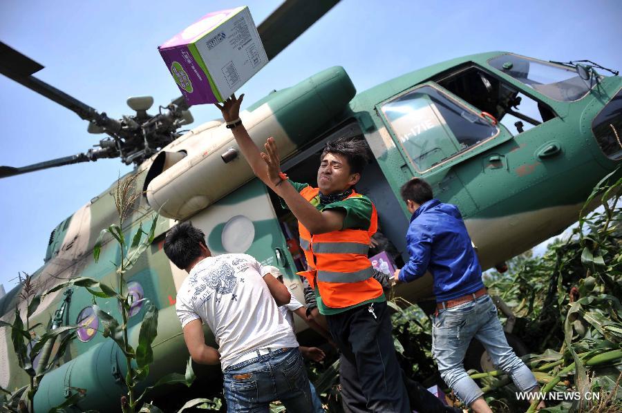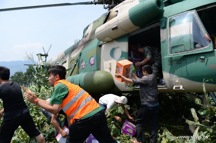 Villagers unload relief supplies from a helicopter in Longjing Village of Longtoushan Town in Ludian County, southwest China's Yunnan Province, Aug. 6, 2014. Death toll from a 6.5-magnitude earthquake that hit Yunnan on Sunday rose to 589. (Xinhua/Xue Yubin)