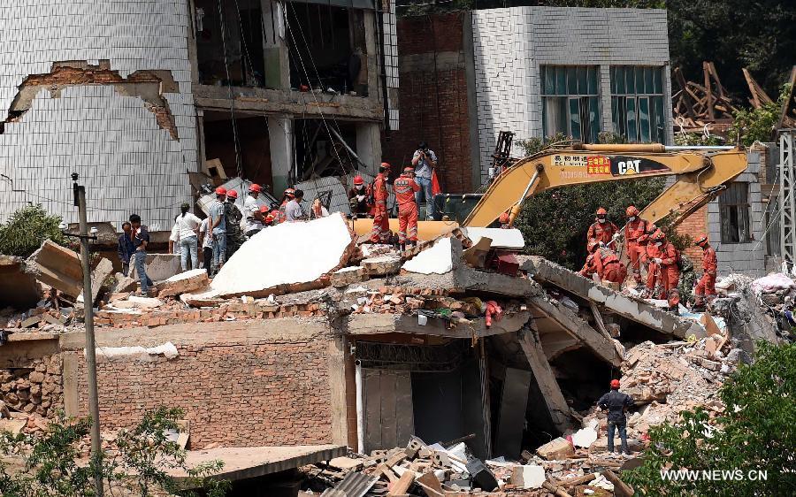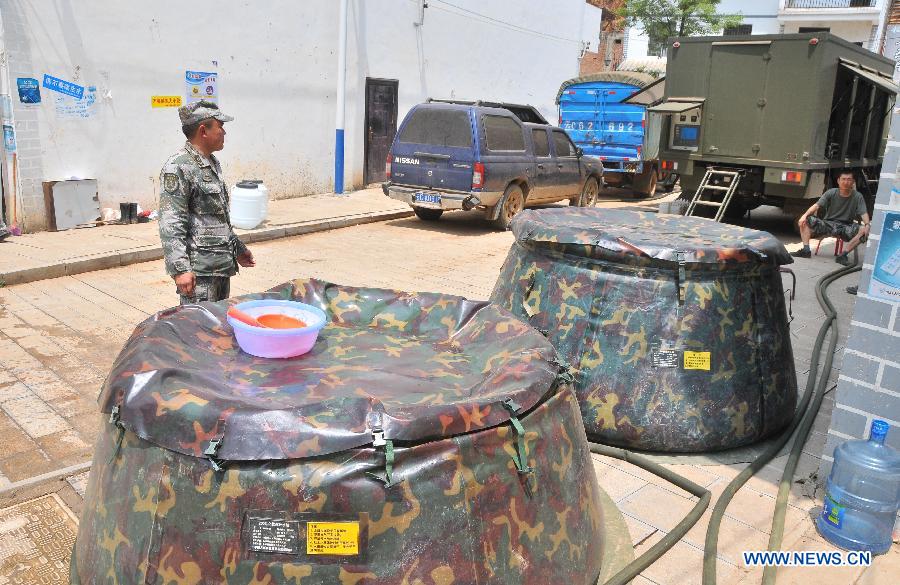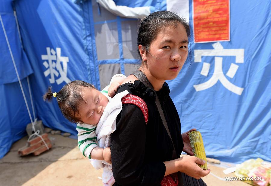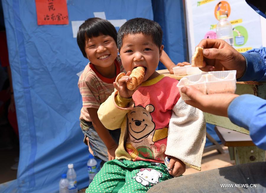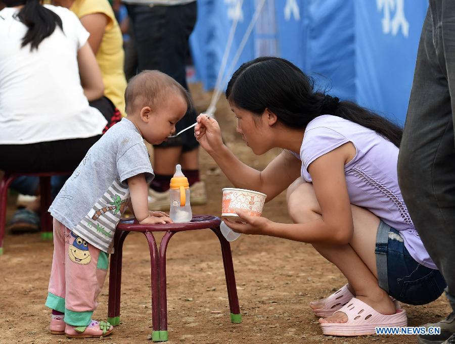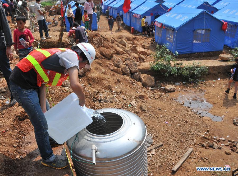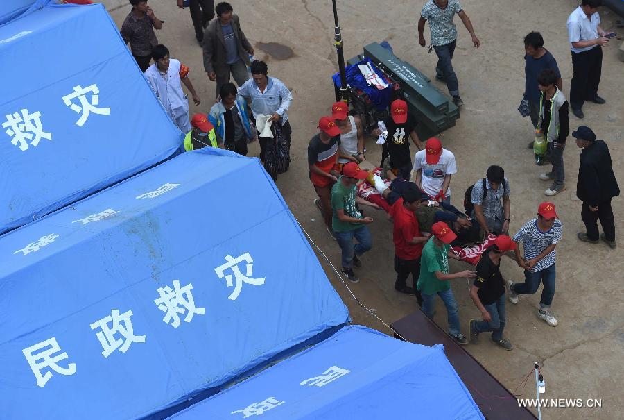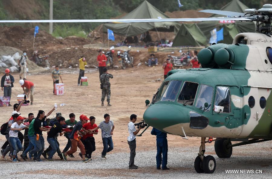 A military helicopter prepares to land in a temporary settlement set up after a 6.5-magnitude earthquake in Ludian County of Zhaotong, southwest China's Yunnan Province, Aug. 6, 2014. Disaster relief work is in progress after the earthquake struck Yunnan on Sunday afternoon. Civillians in temporary settlements within areas that are most severely affected have already had access to fresh meal and potable water. (Xinhua/Lin Yiguang)