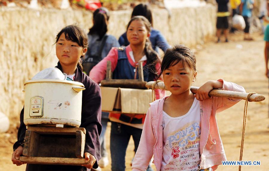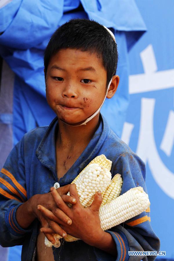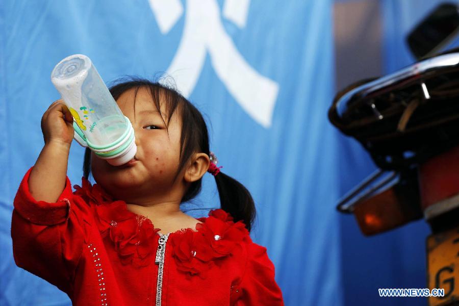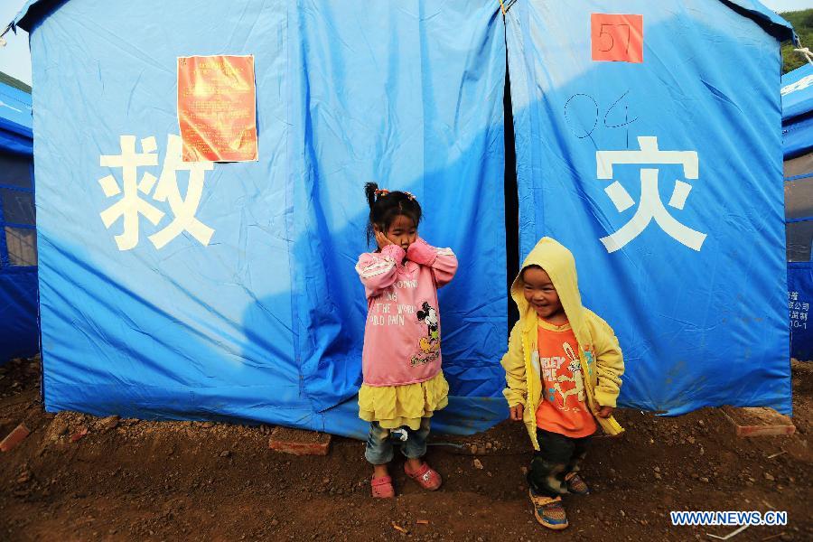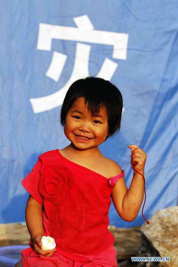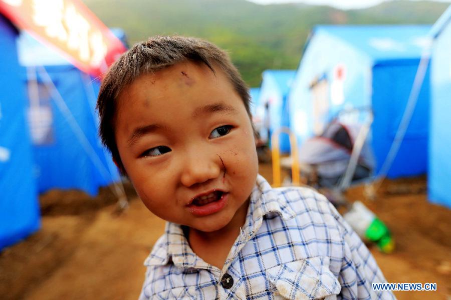 Dai Yingfeng, 3, plays at a temporary resettlement in Longtoushan Town of Ludian County, southwest China's Yunnan Province, Aug. 6, 2014. Death toll from a 6.5-magnitude earthquake that hit Yunnan on Sunday rose to 589. (Xinhua/Xing Guangli)