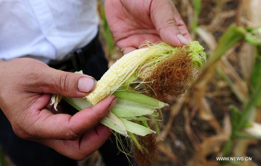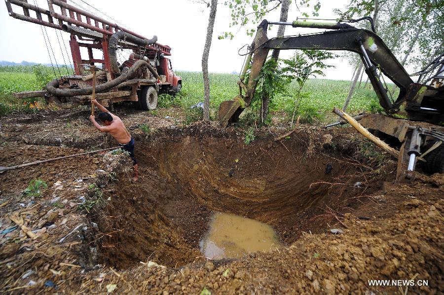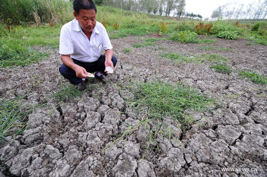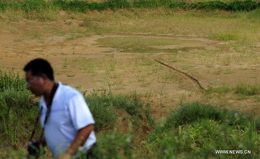 Photo taken on Aug. 5, 2014 shows a dried-up pond at Qingliang Village of Taiping Town, Zaoyang City, Hubei Province. The northern and central parts of Hubei Province have suffered a lingering drought, as high temperature sustained in most areas in Hubei. (Xinhua/Hao Tongqian)