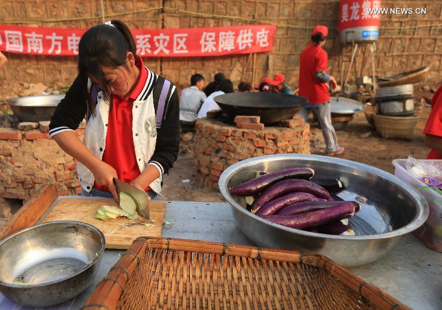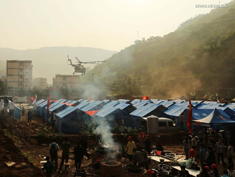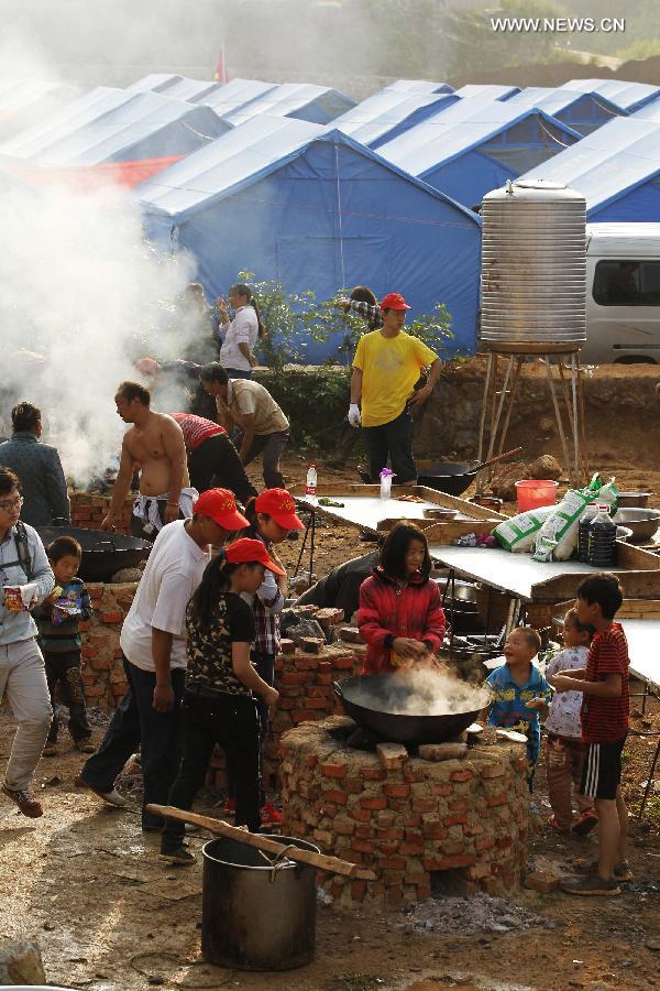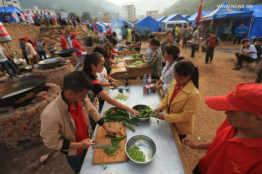 Volunteers prepare breakfast at a temporary resettlement in quake-hit Longtoushan Town of Ludian County, southwest China's Yunnan province, Aug 7, 2014. The 6.5-magnitude earthquake that struck Ludian County on Sunday has caused 589 deaths and injured more than 2,800 people.(Xinhua/Xing Guangli)