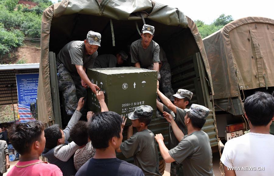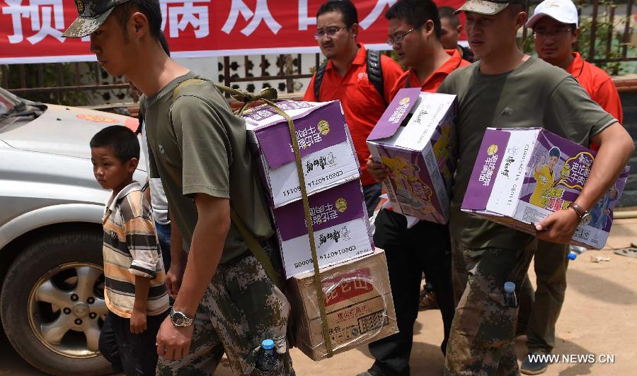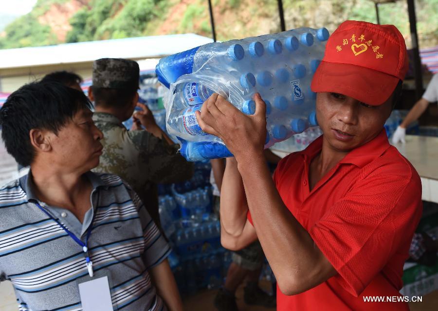 A volunteer conveys bottled water in quake-hit Longtoushan Town of Ludian County, southwest China's Yunnan province, Aug 7, 2014. (Xinhua/Lin Yiguang)
