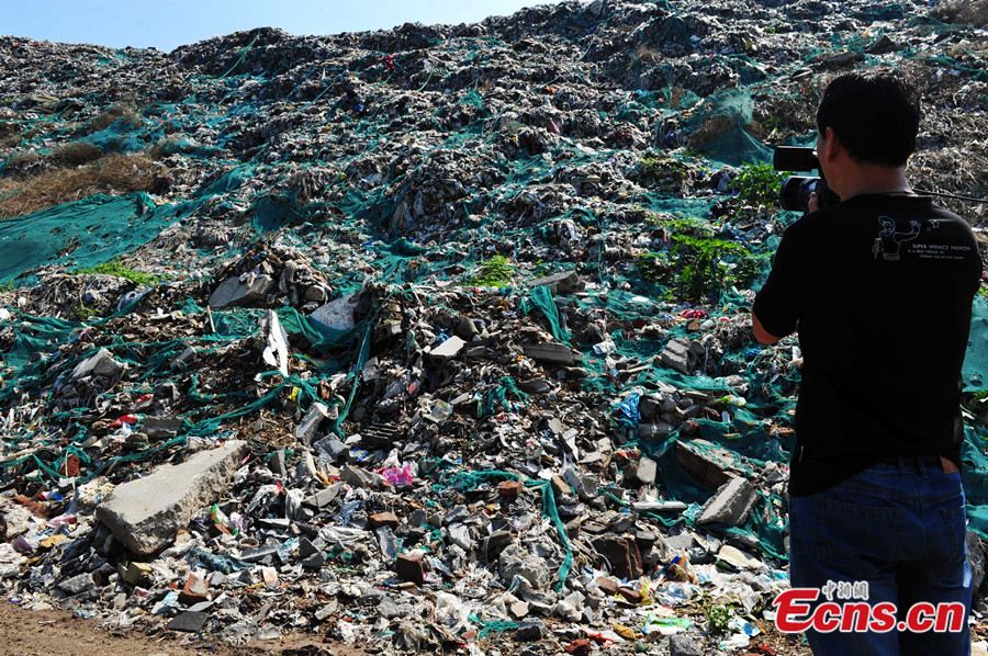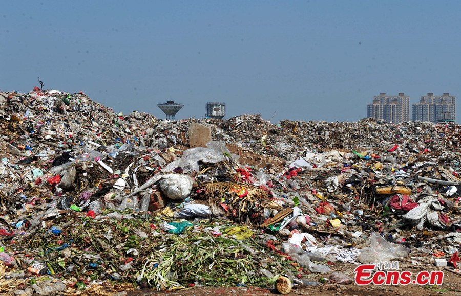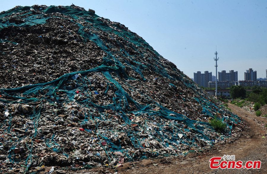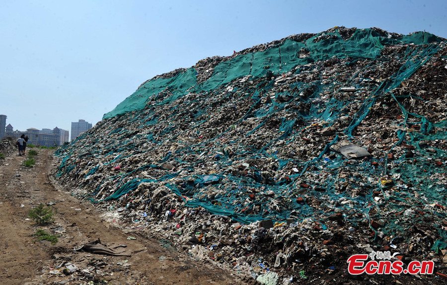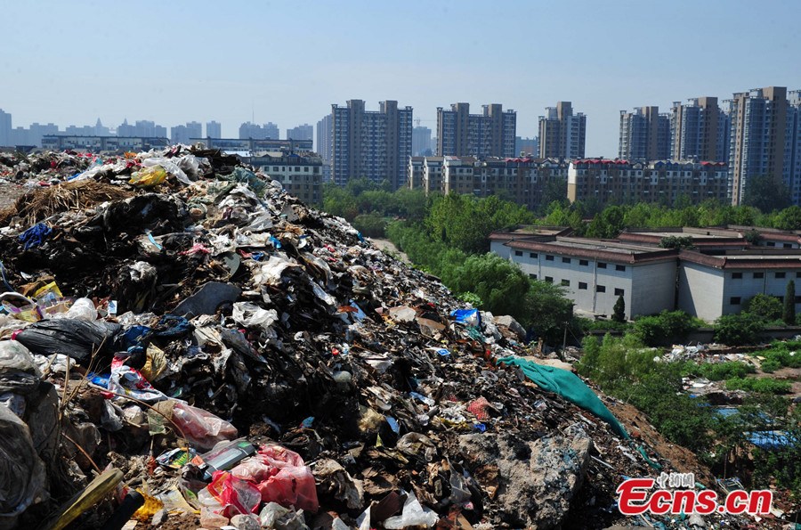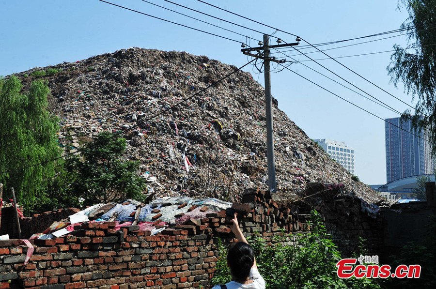 A 30-meter-high garbage mountain is seen at intersection of the Huanghe avenue and Zhufeng street of Shijiazhuang, Hebei province on August 7, 2014. The gigantic waste heap has been formed in the past 30 years as a result of littering behaviors of local residents. Officials of local government said they have started to cope with the situation. [Photo: China News Service/ Zhai Yujia]