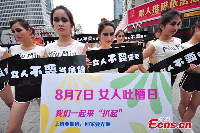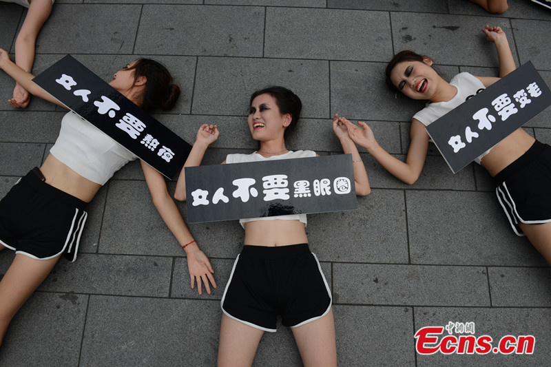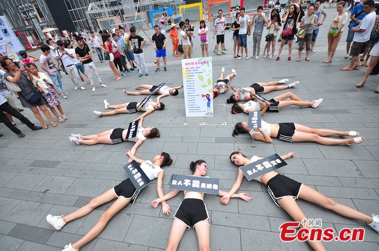 10 young girls lie on ground in downtown Chengdu, Sichuan province on August 7, 2014 to express their demands. With signs which said “I don’t want to be a house slave,” “I don’t like work overtime,””I don’t want to grow old,” hanging in front of their chests, those girls do so to made women’s voices heard by the public. [Photo/ Zhongxin]